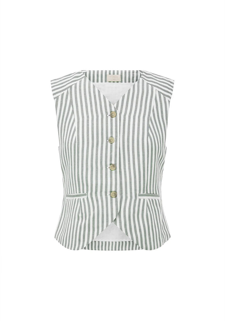 Patterned with classic stripes, the Diana Vest is designed for a close fit and features an elegant, high neckline, centre front buttons and an adjustable waistband at the back. Style it as a set with the matching Lorenzo Pant.
