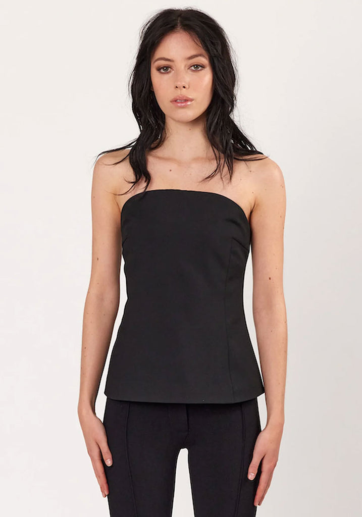 A strapless bodice with a hidden back zip closure. Fitted across the chest and flaring out at the hem to create the illusion of a cinched waist. Made in a modern suiting for that everyday polished look.