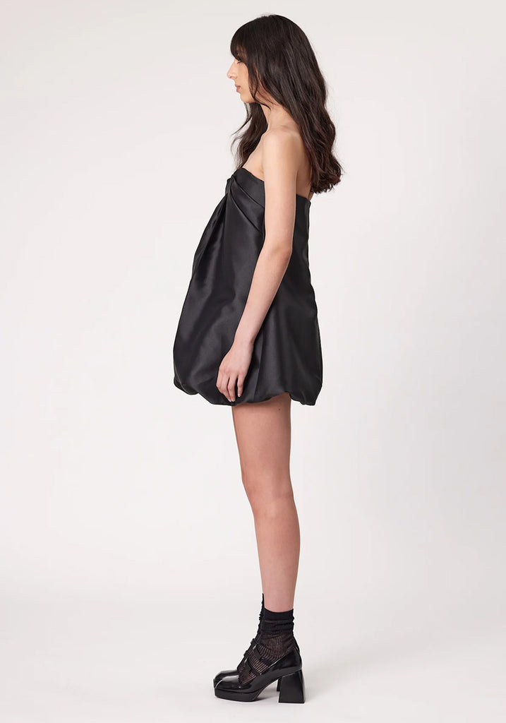 A chic strapless dress with pleated detail and a bubble hem. Made in a timeless satin, adding a touch of luxury to your outfit. Add a pair of heels to transition into the evening. Also available in ivory.