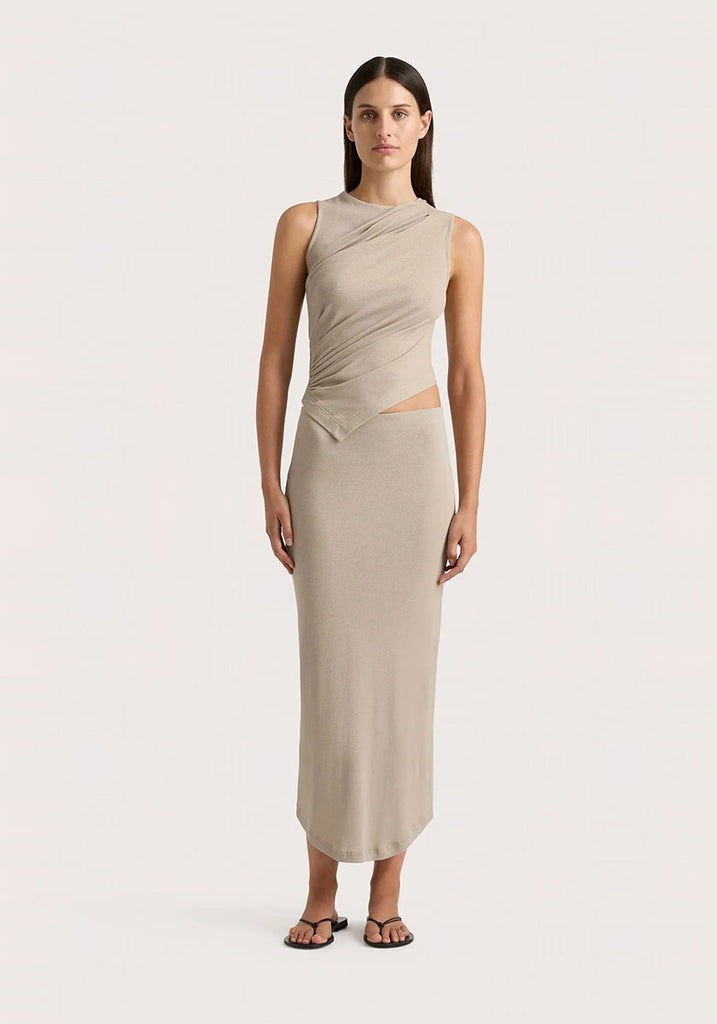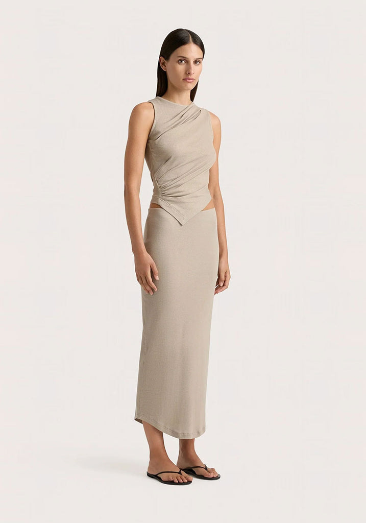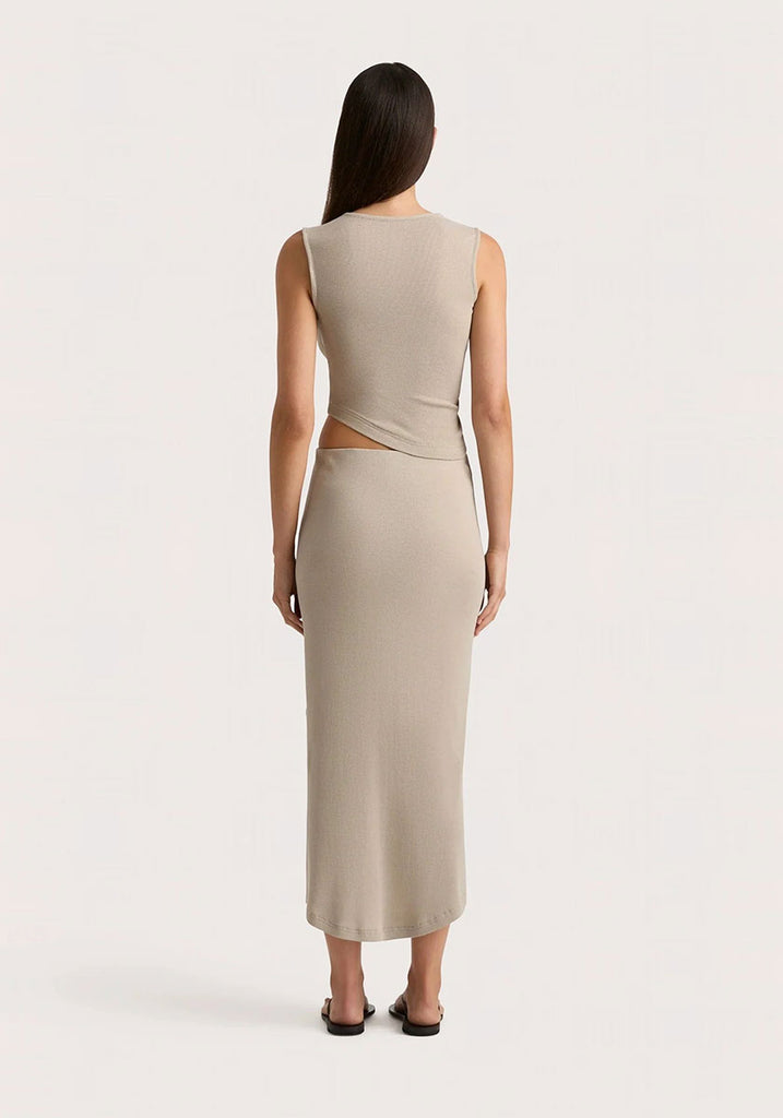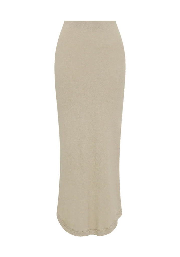 A fitted cotton jersey rib midi skirt that sits mid-rise on the waist with a curved hemline. Elastane is woven through the fabric for comfort and additional stretch. Designed in a creamy neutral hue, it is the ideal addition to your capsule wardrobe, pairing with the Loire Top or T-Shirt for a transeasonal tonal look.