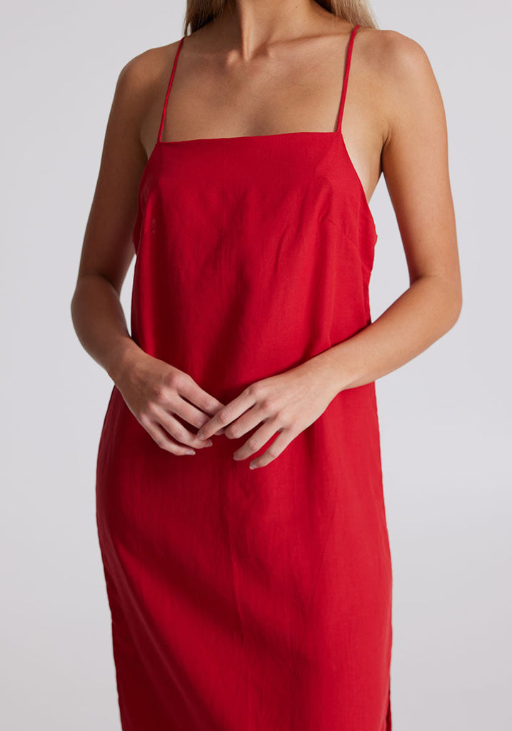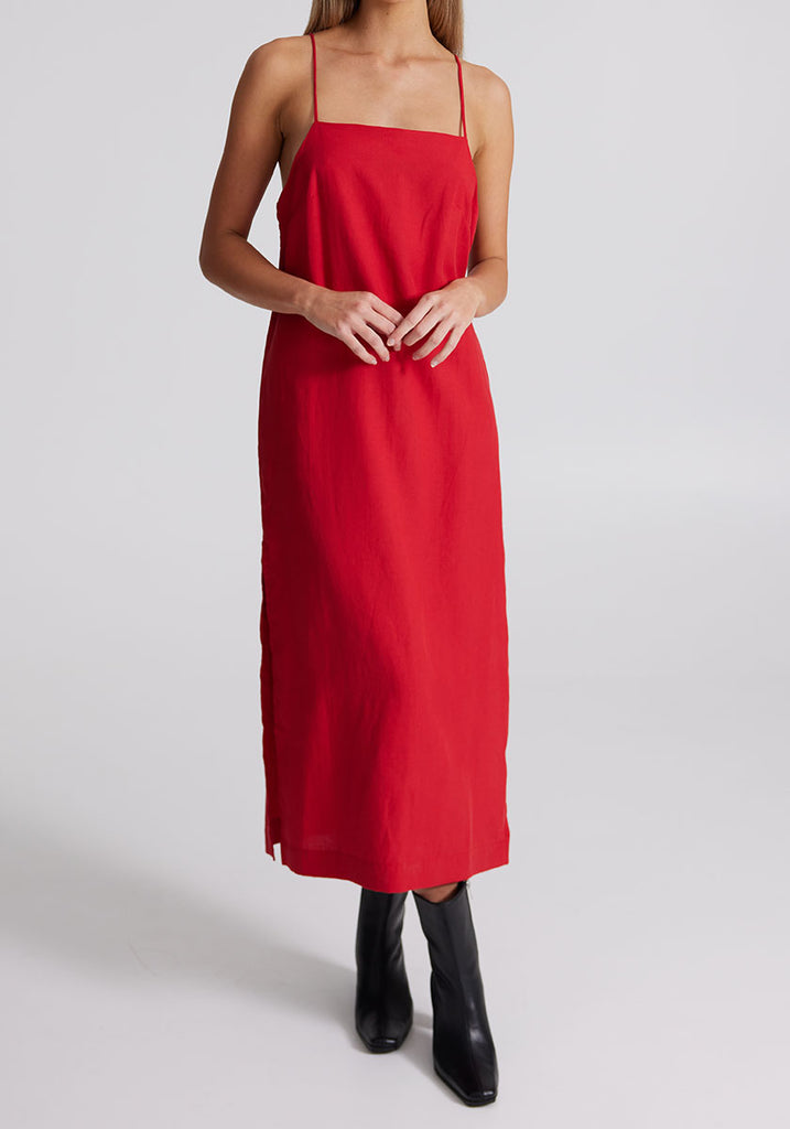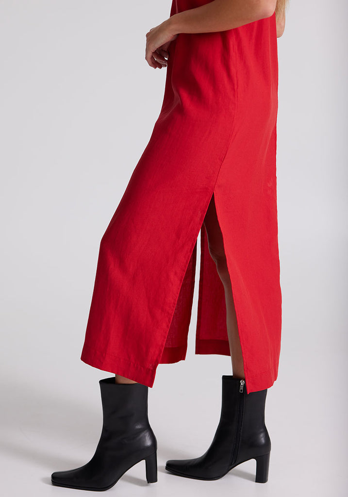 The rich Barbados Cherry hue adds a vibrant touch to any occasion, making it a classic but standout piece in your wardrobe. The maxi length exudes a sense of refinement, perfect for stylish relaxed look or the versatility to dress up for an occasion.