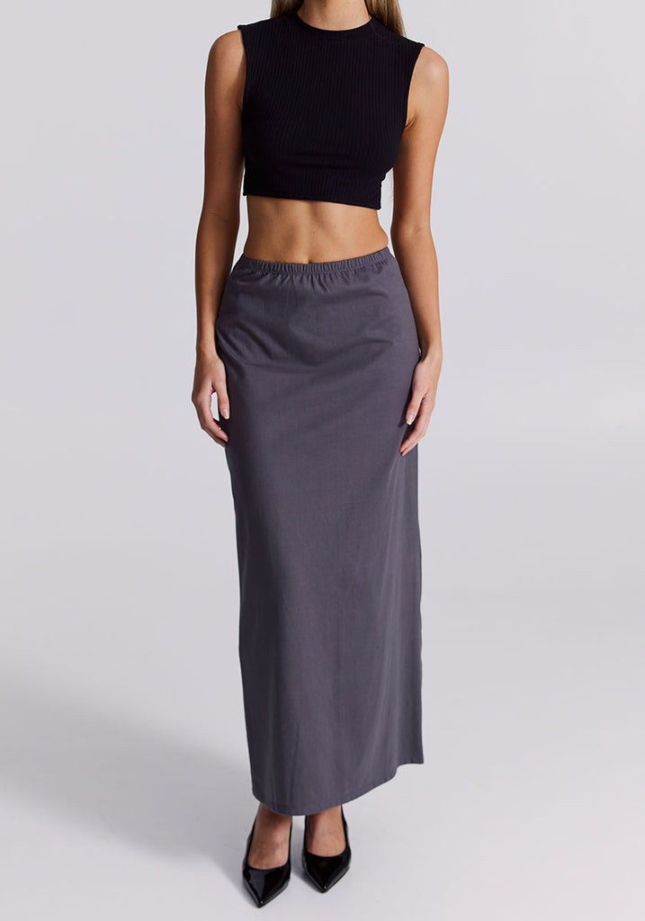 Discover effortless elegance with our Pull On Jersey Maxi Skirt in Charcoal. Crafted from soft  jersey fabric, this skirt promises comfort without compromising style. The pull-on design ensures a smooth silhouette, while the charcoal colour adds a point of difference whilst maintaining wearability.