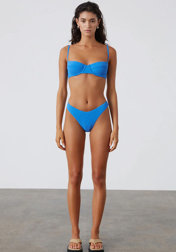 The Ocean Blue Textured Curve Brief by Zulu & Zephyr is a best-selling shape, offering a softly curved waistline and high-cut leg with flattering wide sides, designed to be worn high on the hips. Made from a textured fabric in a vibrant ocean blue. Pair with the Ocean Blue Textured Balconette Bra Cup for a coordinated set.