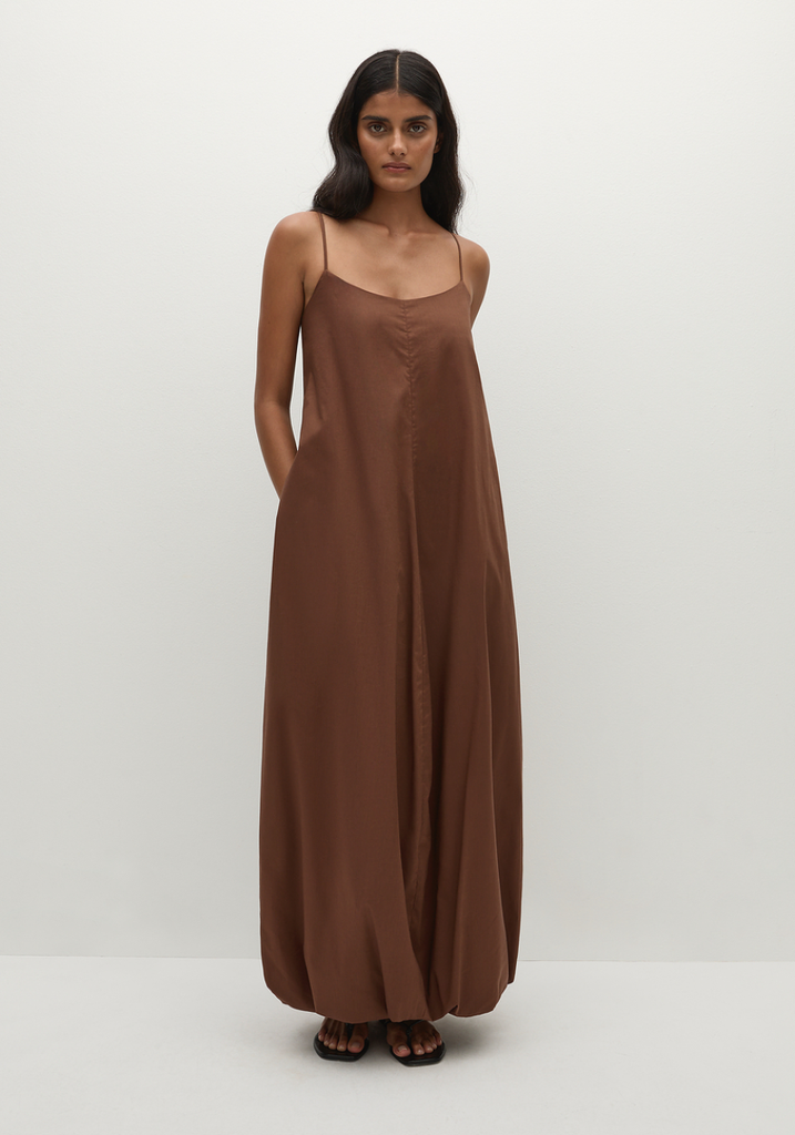 A signature FAITHFULL silhouette, reimagined with new elevated details and designed from a 100% cotton in a chestnut brown. It features a rounded neckline with thin straps, adjustable in length, that is relaxed in fit through the upper body. It then falls into a voluminous silhouette with an oversized bubble skirt, elasticated at the cuff and cropping around the ankles. The perfect vacation companion, style with a simple sandal for long lunch wear.