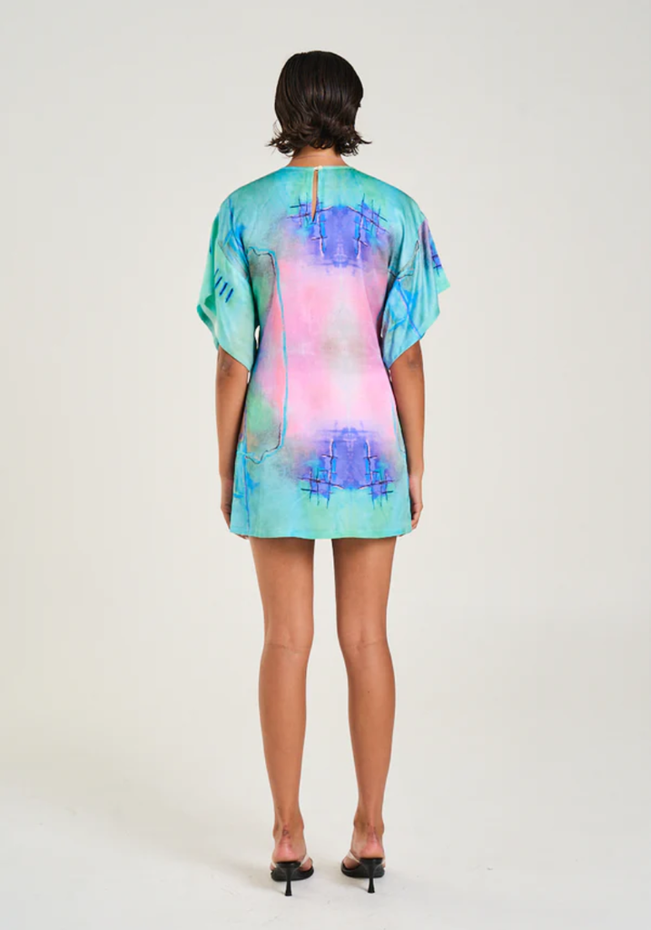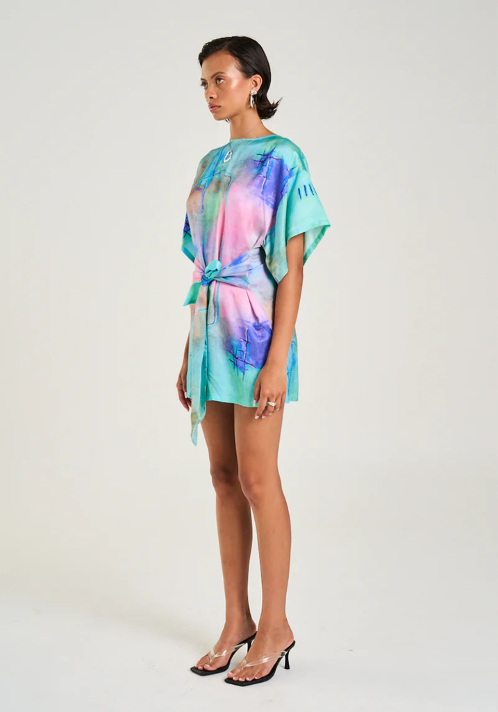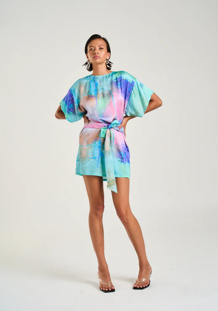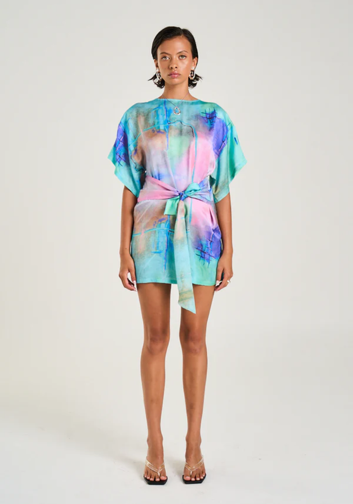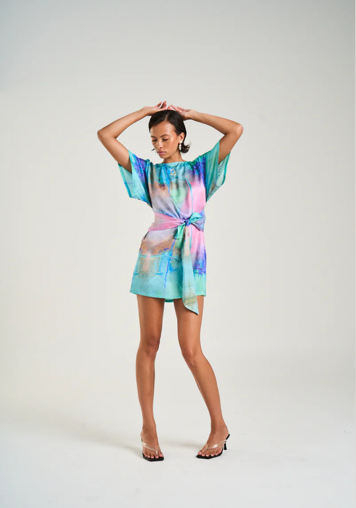 The Tie Front Dress featuring the hand-painted H20 artwork offers a versatile, figure-flattering design boasting a high neckline, modest sleeves, and a modern mini silhouette. Its wrap overlay ties at the side, allowing you to customise the length and fit to suit your style. Crafted from a silky viscose and rayon blend, this dress combines comfort with a refined finish, making it ideal for both casual and polished looks.