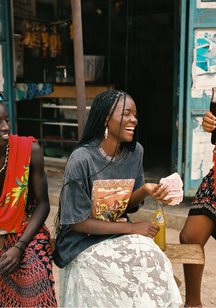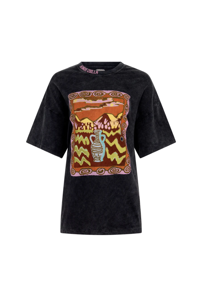 The Verdant Dust Tee in charcoal is an oversized graphic tee featuring a striking hand-drawn print of a desert scape. With its soft stone-washed finish and relaxed silhouette, this handcrafted piece embodies effortless style and everyday luxury. Perfect for the traveller at heart.