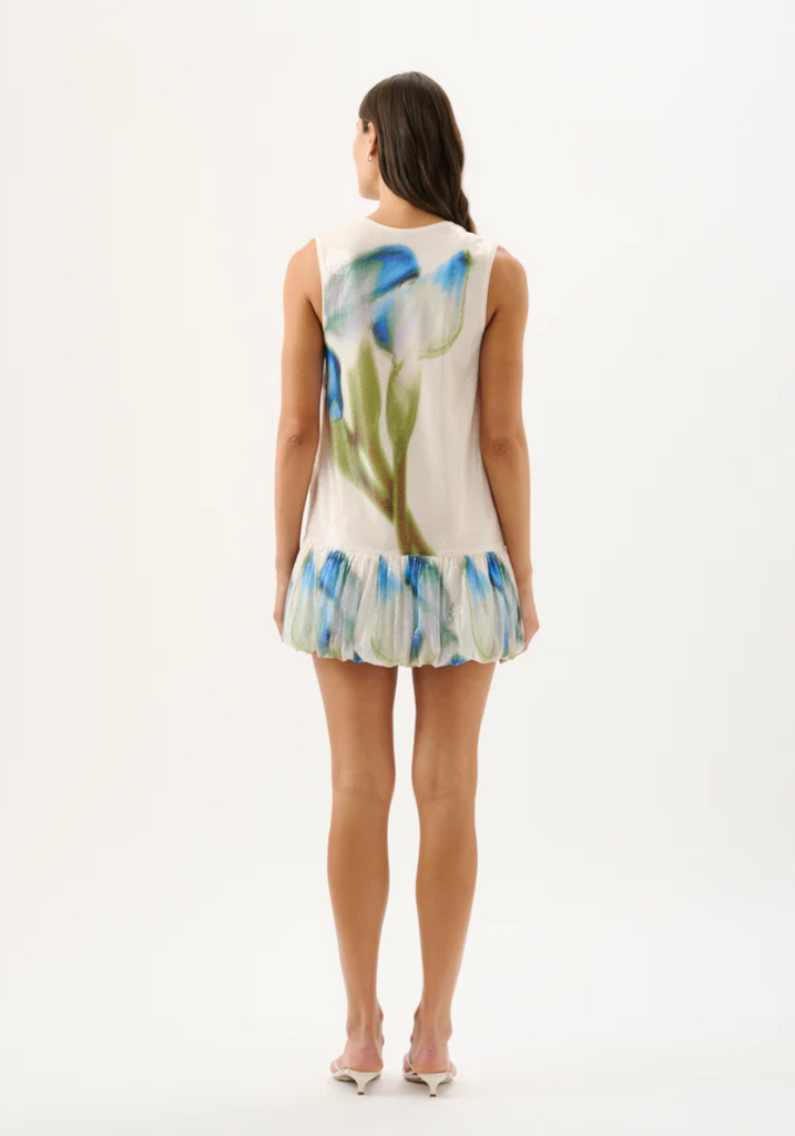 A Roame. take on the bubble silhouette, the Bambi Dress features our exclusive Starlit Lily print. This true mini silhouette captivates with shimmering micro sequins, a flattering low scoop neckline and a drop-waist bubble skirt for a playful yet sophisticated finish.