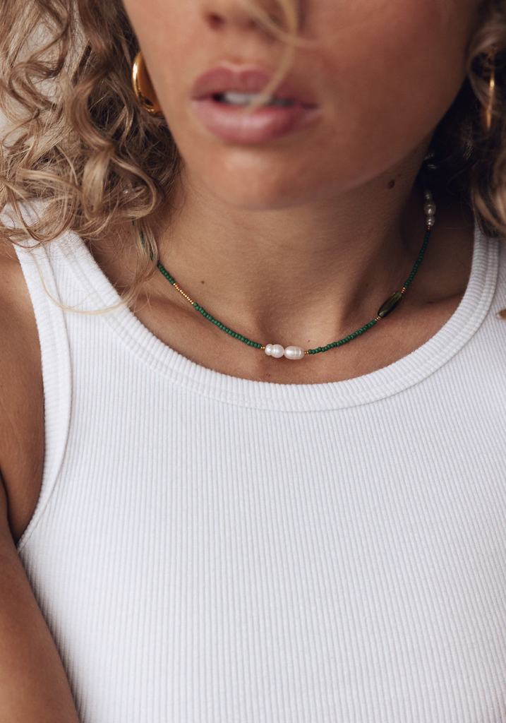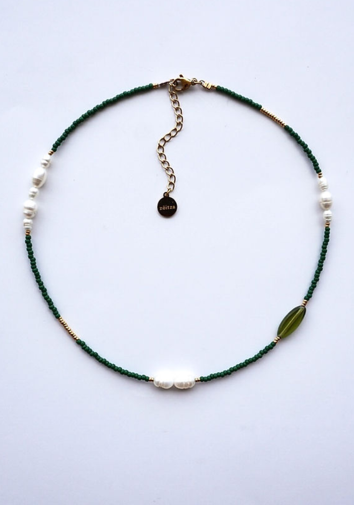 Green seed beads, freshwater rice pearls, green transparent glass bead, and 24kt gold plated or stainless steel beads.