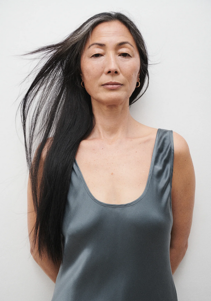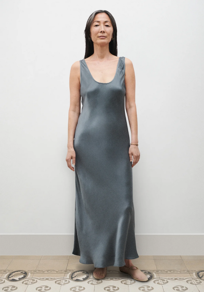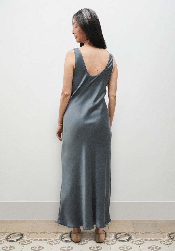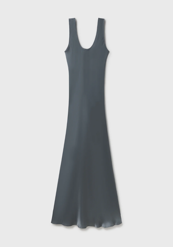 Silk Laundry Scoop Neck Dress in 100% silk satin, tailored with a bias cut for a regular fit. Sleeveless with a scoop neckline, flowing into an ankle-length hem.