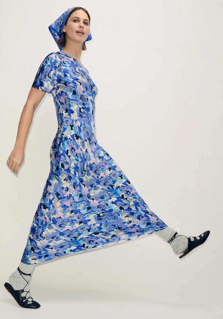 Silk Laundry Short Sleeve Bias Cut Dress, made from 100% silk. Cut on the bias with an ankle length hemline. Featuring a round neckline, detailed with a logo chain.