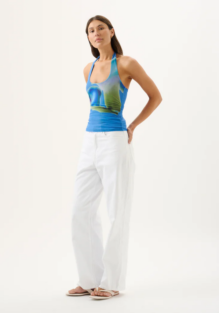 Elevate your wardrobe with the Thea Top in our exclusive Moonlit Lily print. A flattering scoop neckline, ruched waist, and halter tie detail create a modern feminine silhouette.