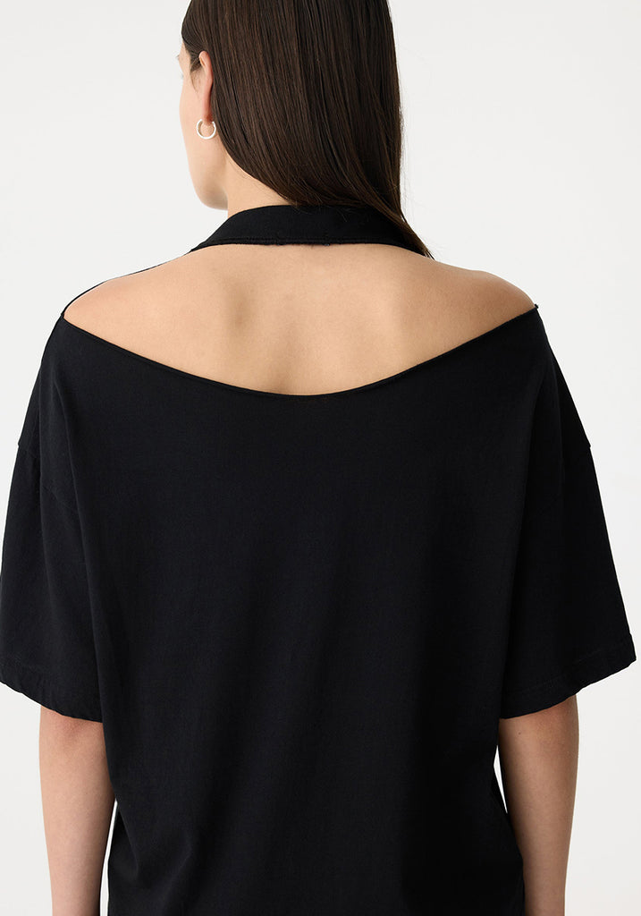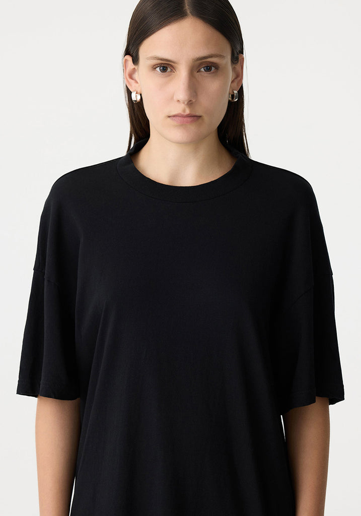 crafted in fluid organic cotton single jersey, the floating neck boxy short sleeve dress is designed as a classic slip-on style in a relaxed, boxy silhouette. the final garment boasts a mini length, dropped shoulder seams and elongated short sleeves. refined by a floating rib neck and upper back cut out.