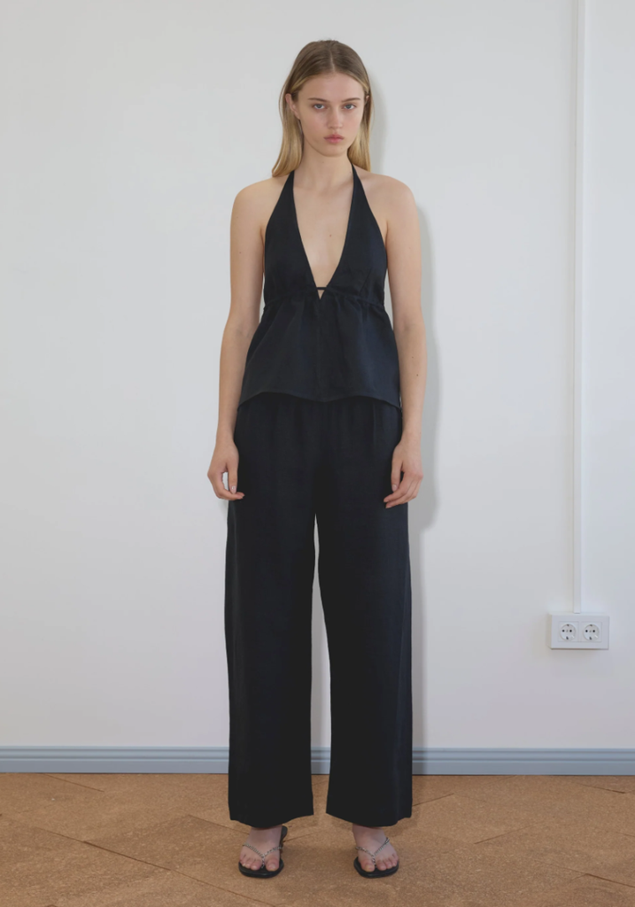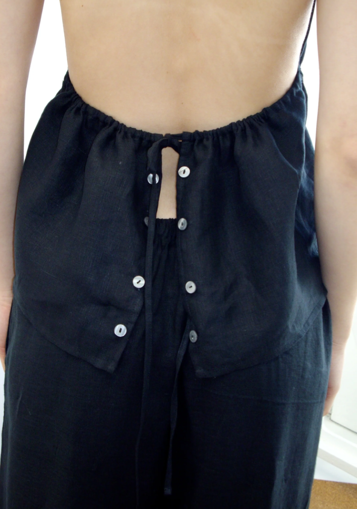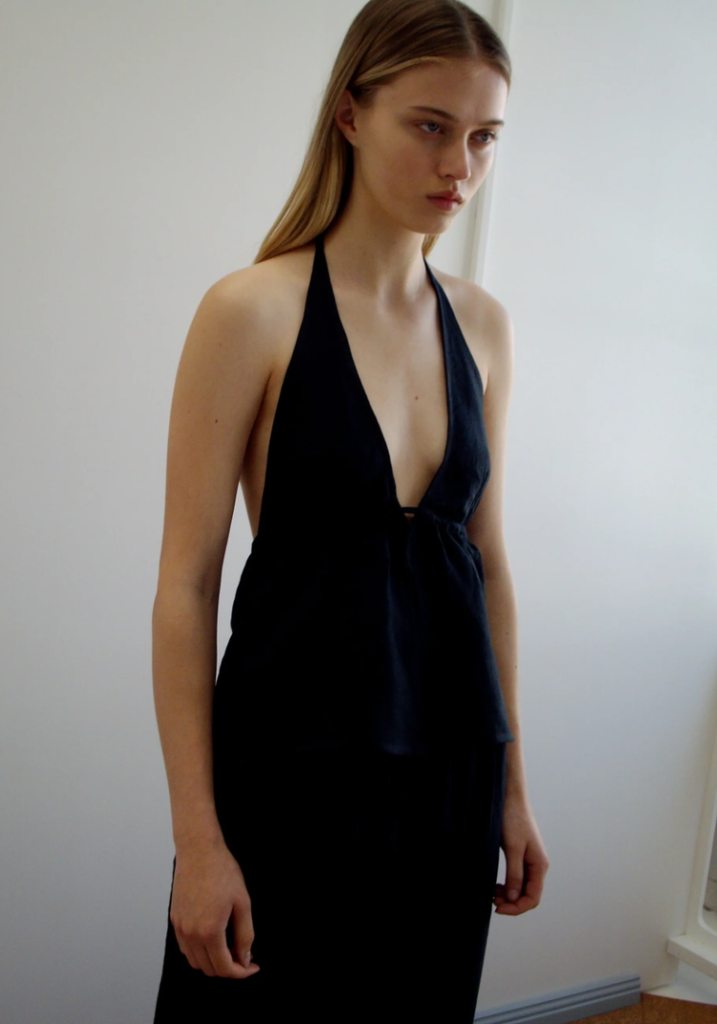 relaxed halter top features flattering v neckline, exposed drawcord front, adjustable backline with drawcord tie closure and silver button detail on split back