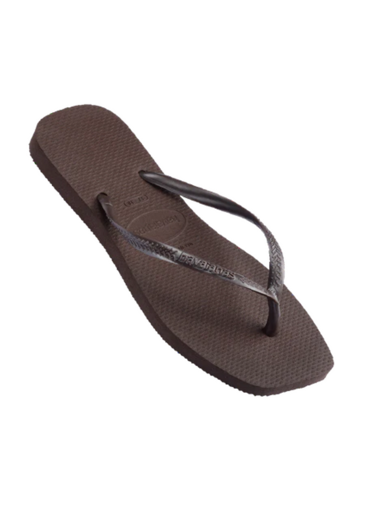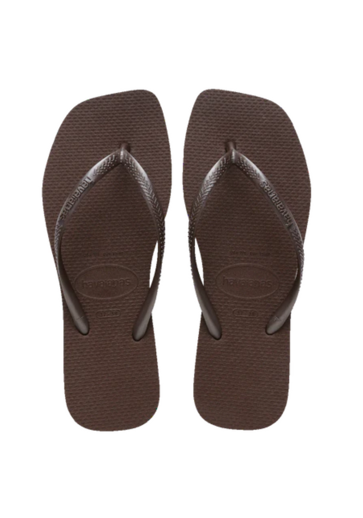 Introducing the Havaianas Slim Square Logo Pop-Up Thongs in Dark Brown.