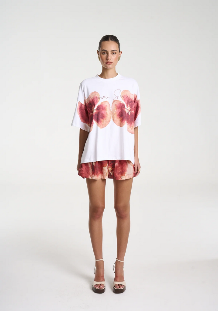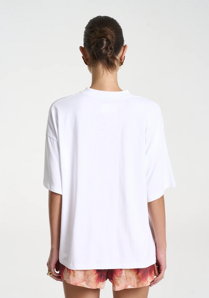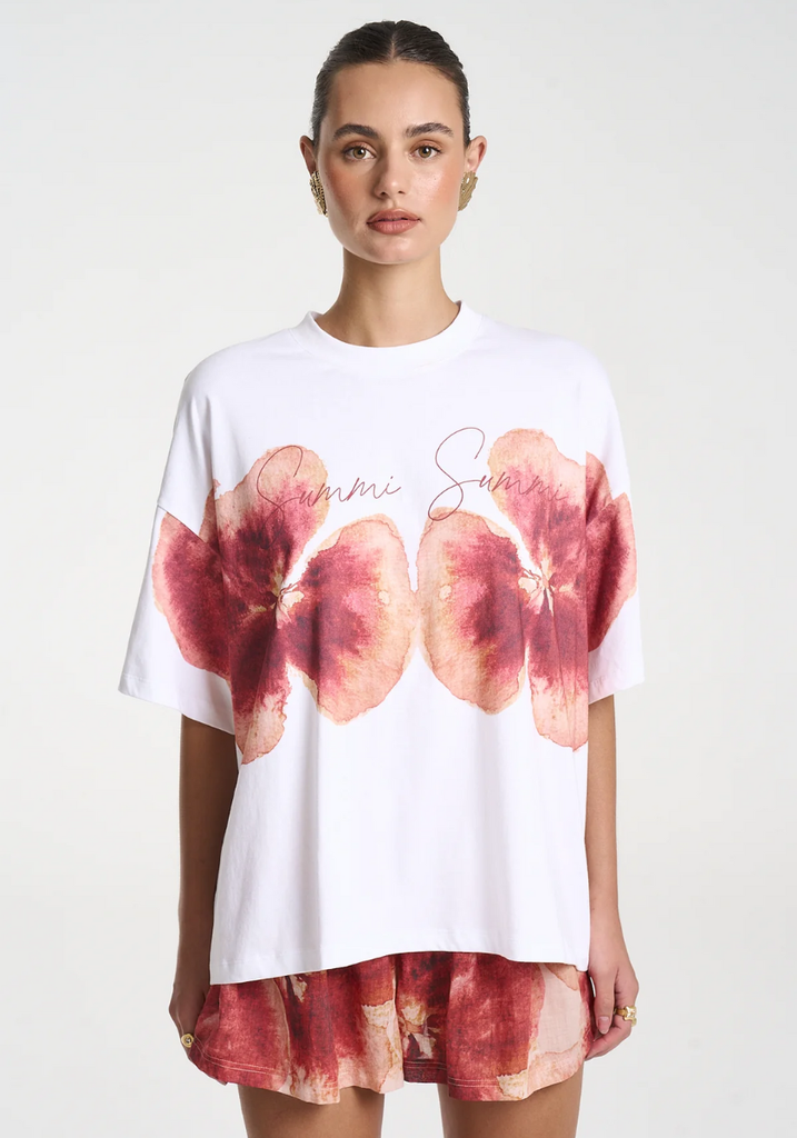 This timeless white tee offers a slightly cropped and relaxed fit, highlighted by the hand-painted Aloha motifs and Summi Summi text.