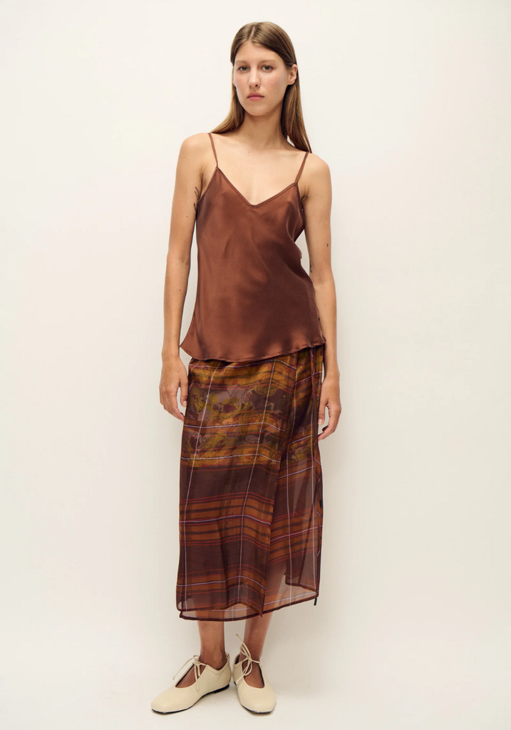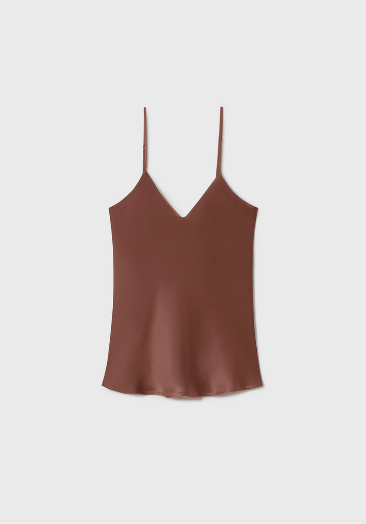 Silk Laundry bias cut cami in 100% silk satin with contrast binding. Designed with a fluid drape and adjustable straps.