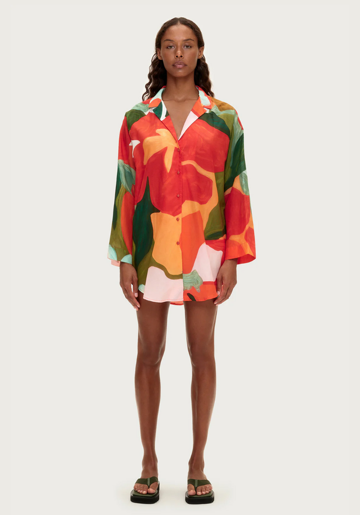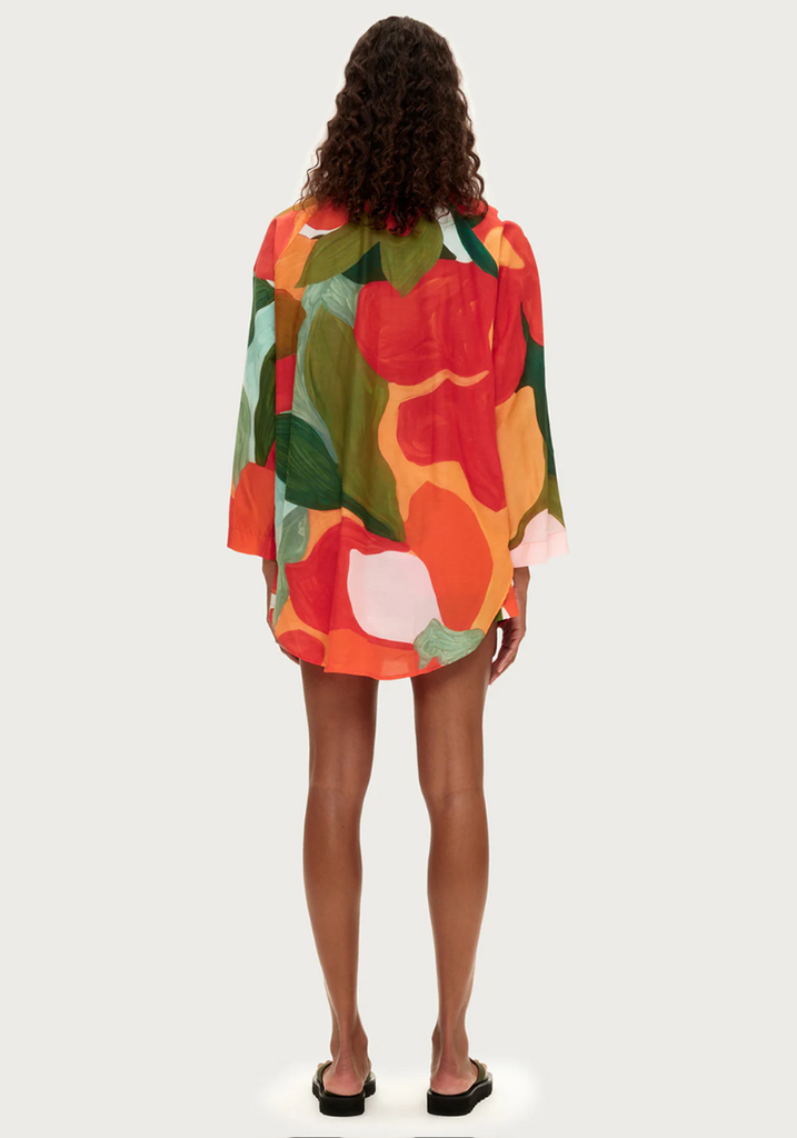 A lightweight, relaxed-fit long-length shirt in a soft cotton-silk blend with hand-painted floral print. Features an open collar, cuffless long sleeves, and front buttons. Perfect layered over swimwear or resort looks.