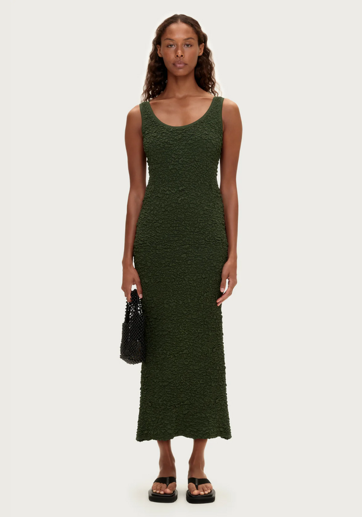 A sleeveless, slim fit maxi dress featuring soft scoop necklines at the front and back, made from a crinkled, dense textured fabric and finished with a rear centre hem split for an easy, resortwear look.