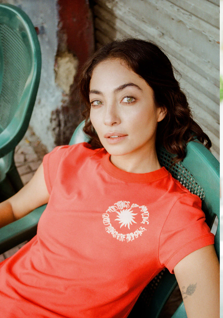 The kind of throw-on piece that instantly lifts your mood. Made from soft cotton jersey in a bright, punchy coral, it features a small circular chest graphic reminding you that good things are coming.