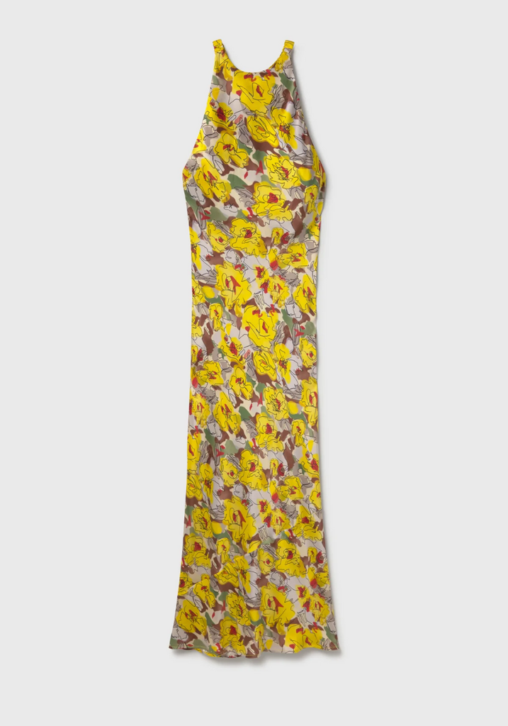 Silk Laundry High Low Dress, made from 100% silk. Cut on the bias, featuring a halter neckline and exposed, low-back back detail.