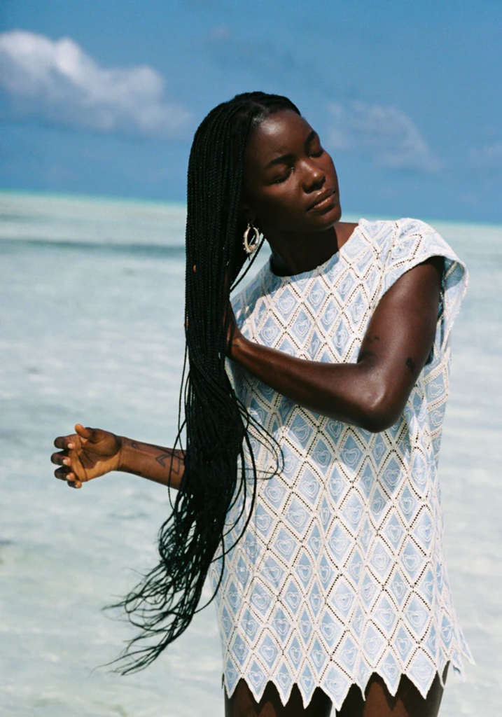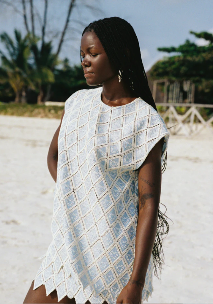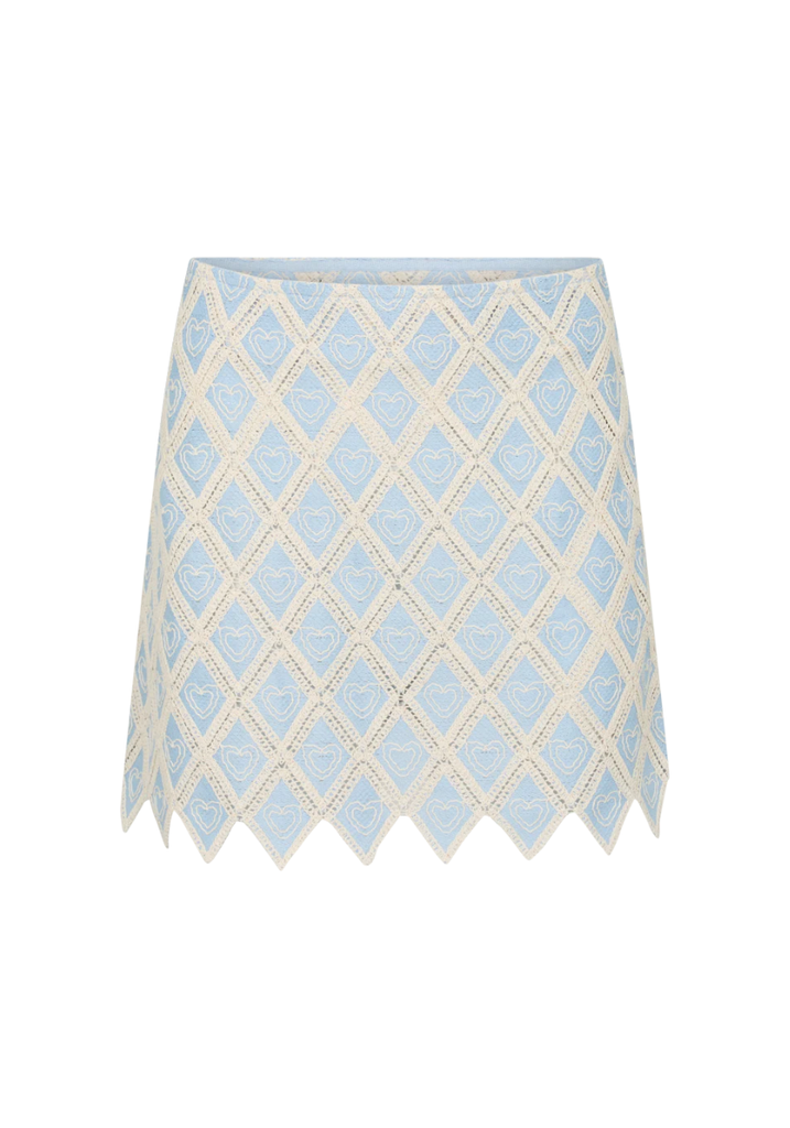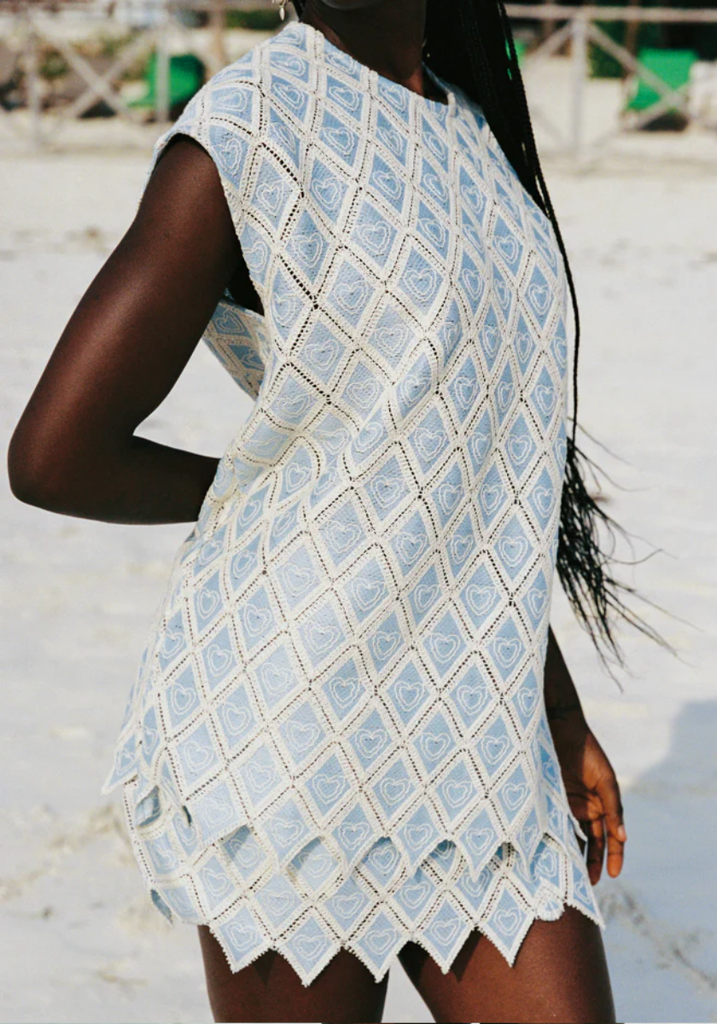 The Laguna Lita Mini Skirt in soft blue is a playful yet sophisticated piece that showcases exceptional artisanal craftsmanship. Featuring an intricate geometric diamond pattern created through delicate hand-finished embroidery and cutwork in sky blue and golden beige tones, this mini skirt is finished with a charming scalloped hem that adds movement and feminine detail. The elasticated waistband ensures effortless comfort, while the textured cotton fabric creates a luxurious feel. Perfect for pairing with the matching Laguna Amante Blouse or styling separately for versatile resort elegance.
