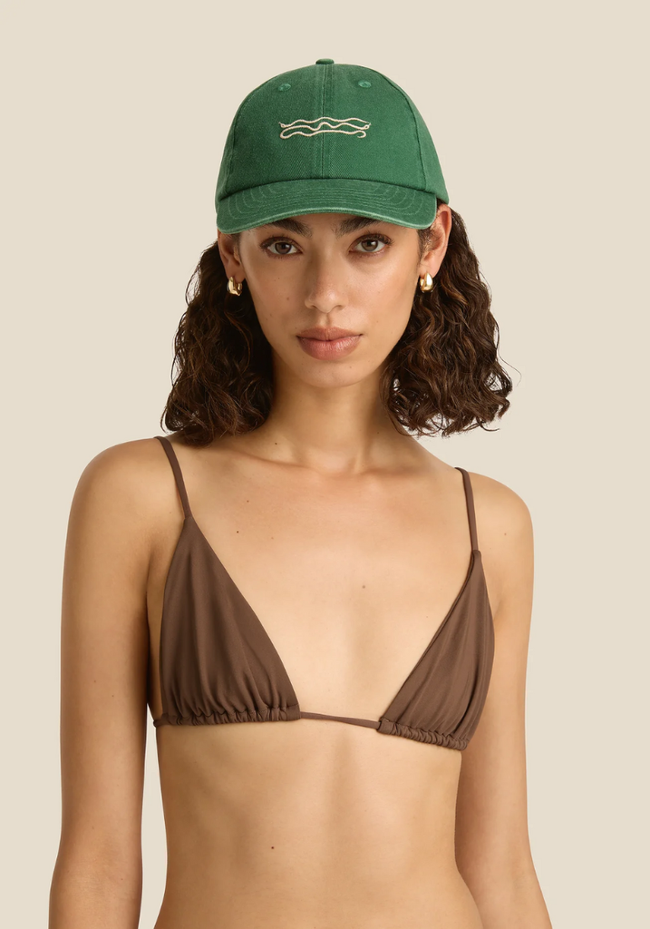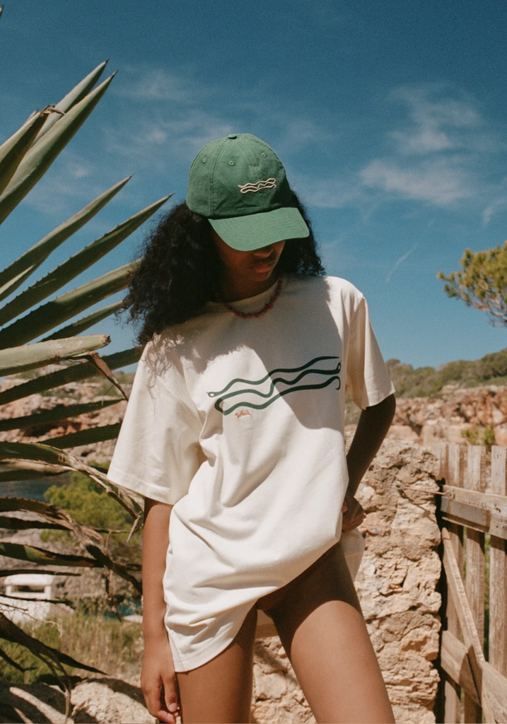 Our take on the classic, dad cap. It’s unstructured, sits low on the crown, and is fully adjustable to fit most. The front panel features embroidery of our hand-painted snake motif — a key element from our Charm design. Crafted from 100% recycled cotton, with brushed gold hardware and our signature Soleil Soleil logo on the back.