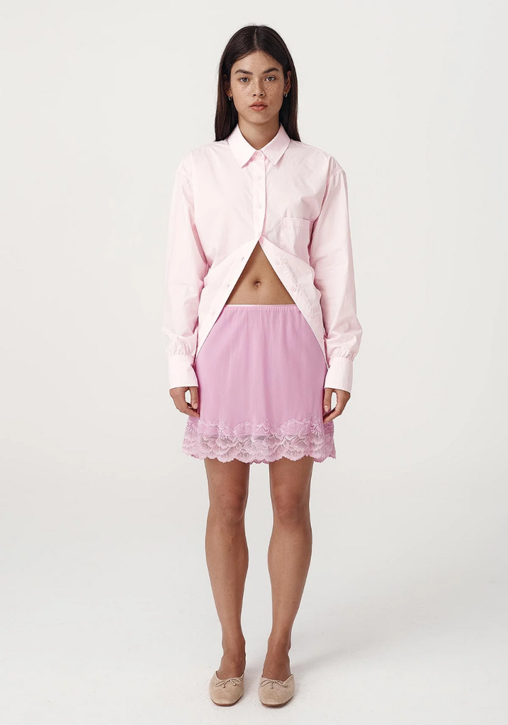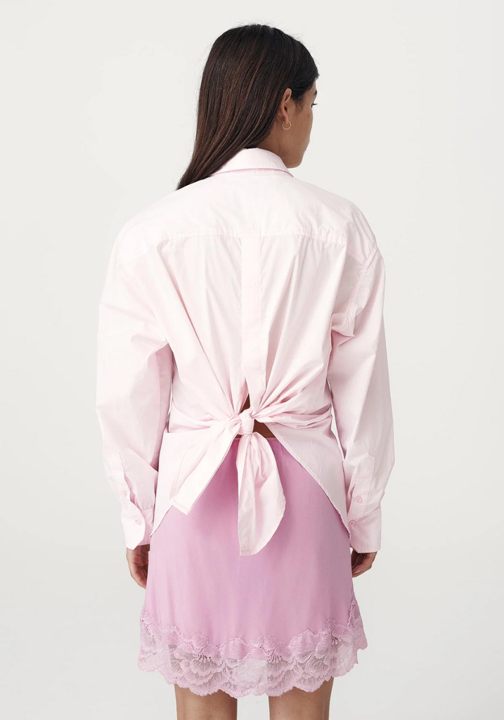 A relaxed Boyfriend-fit cotton shirt with a straight collar, curved hem and single patch pocket. Adjustable back buttons allow it to be worn loose or tied, offering a fresh, softly structured take on everyday shirting.