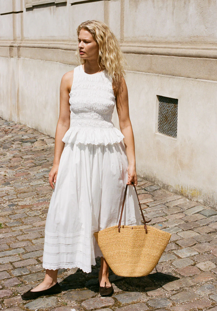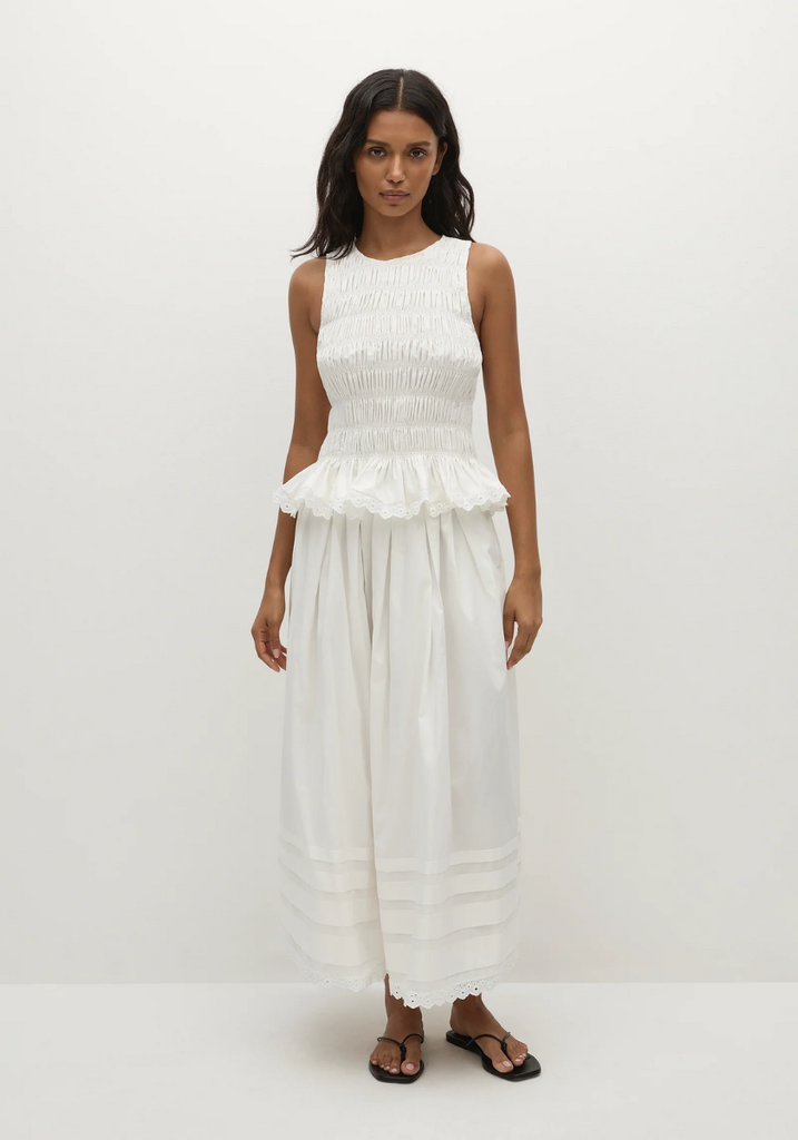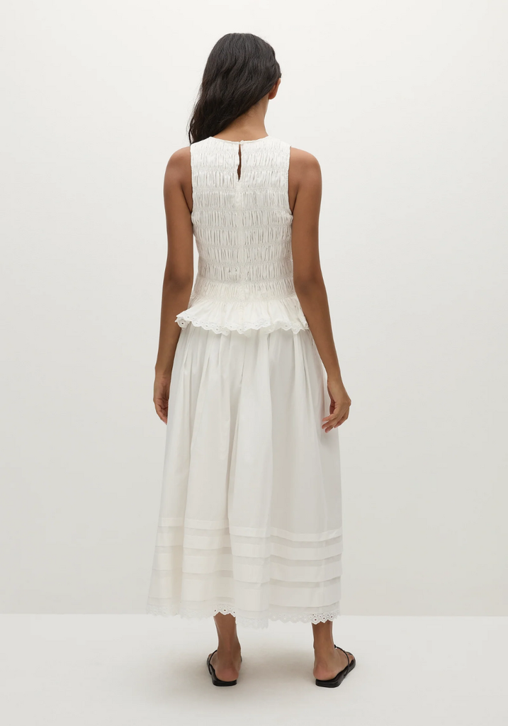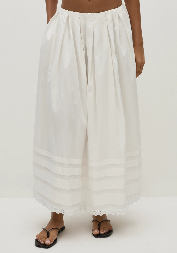 A mid-rise midi skirt, designed to sit effortlessly on the hips under the matching Thea Top. Elasticated for a comfortable fit, the waistband is hidden by a delicate tuck detail. It then falls into a softly gathered A-line skirt with four tiers of tuck detailing around the bottom of the skirt and a vintage lace trim around the hem. Designed from a crisp white cotton, it is the perfect feminine addition to your vacation wardrobe.