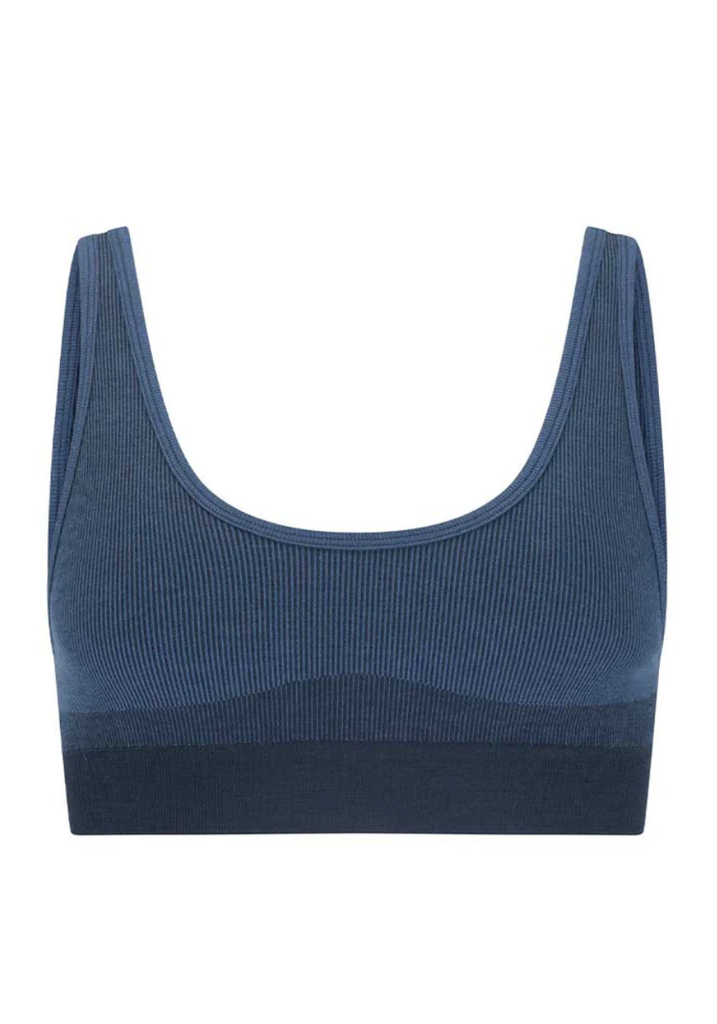 Superfine Merino wool seamless knit v-neck crop in our premium rib fabrication. Offers mid compression and lined with a self knit layer for support. This style features a contrast underbust design lines that shape the bust and a minimal jacquard logo at back hem band. Designed with highly breathable natural fibres for a super-soft second-skin feel against the body.