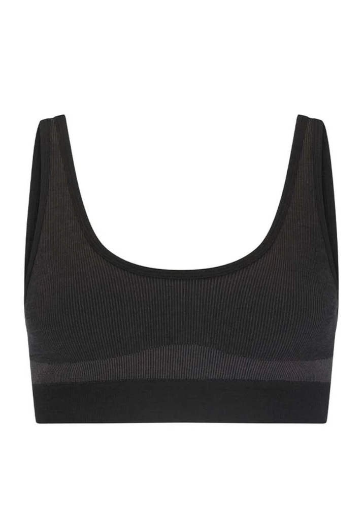 Superfine Merino wool seamless knit v-neck crop in our premium rib fabrication. Offers mid compression and lined with a self knit layer for support. This style features a contrast underbust design lines that shape the bust and a minimal jacquard logo at back hem band. Designed with highly breathable natural fibres for a super-soft second-skin feel against the body.