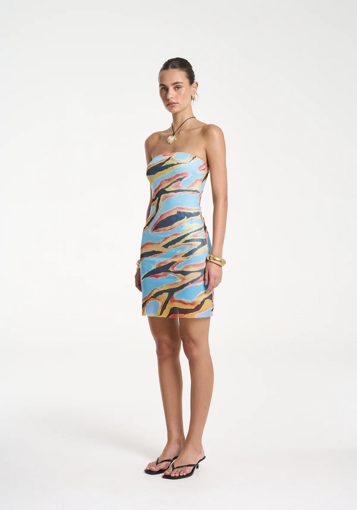 The Strapless Mesh Mini showcasing the hand-painted Zanzibar print offers a form-fitting design with a double layered construction. It provides medium to sheer coverage and a flattering silhouette.