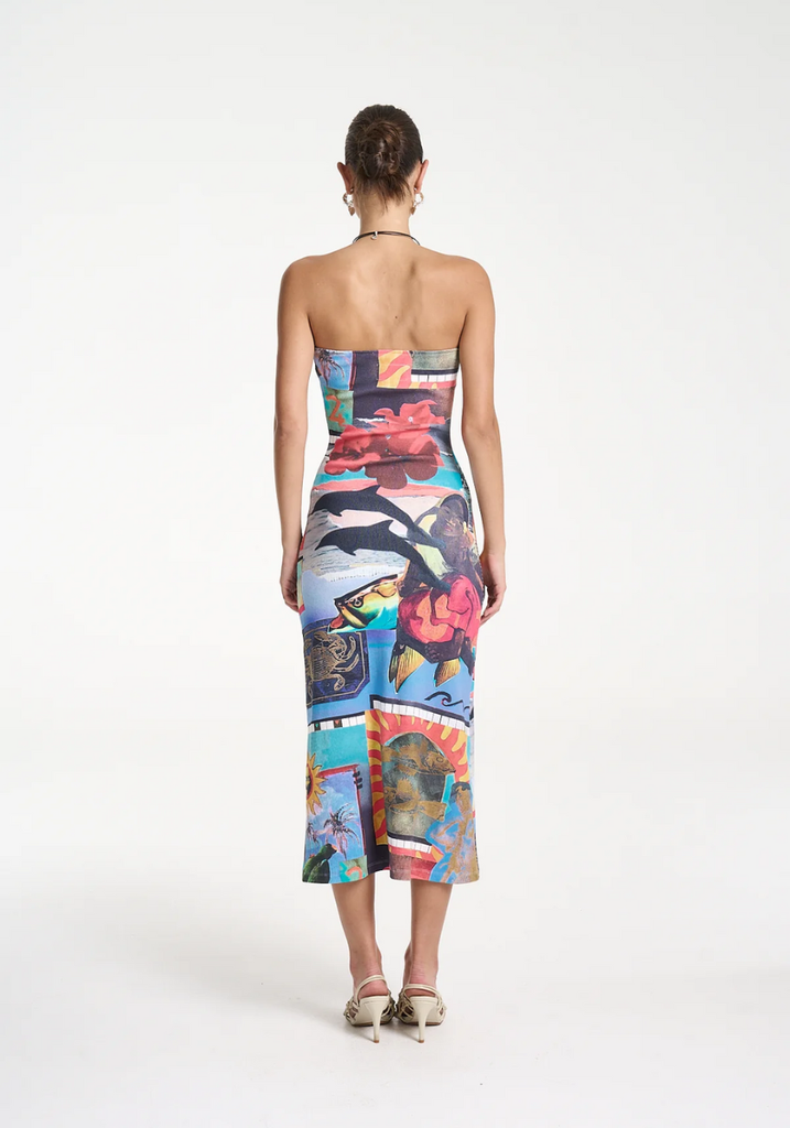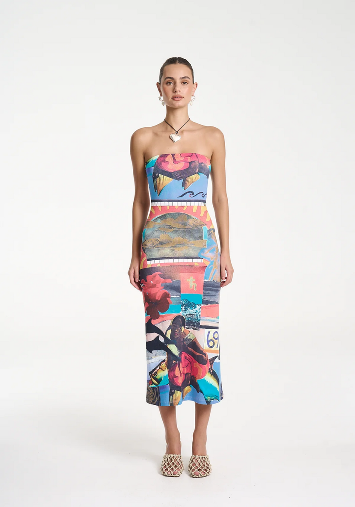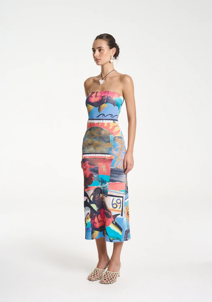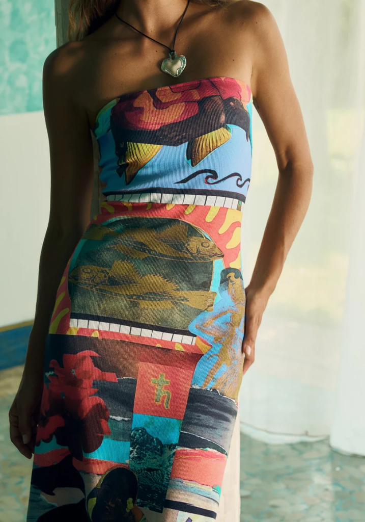 This Strapless Midi dress showcasing the Loco mixed media artwork is made from structured ribbed cotton creating a form-fitting and flattering silhouette.