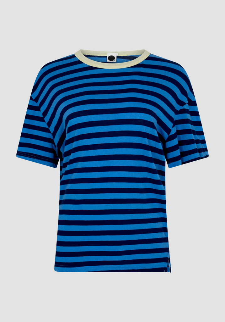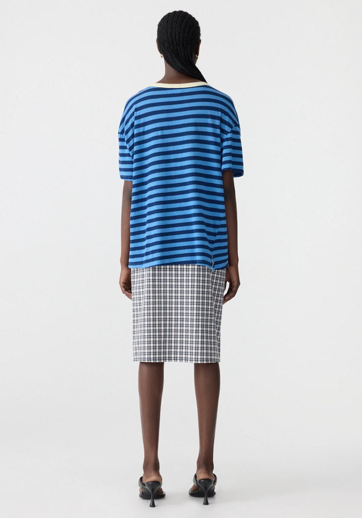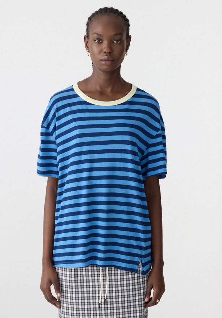 A new classic in lightweight organic cotton single jersey. The stripe Boyfriend T-Shirt is a foundational wardrobe element relaxed by dropped shoulder seams and a slouched silhouette. Refined by a contrast rib heritage neck bind and side split seams. Distinguished by signature Bassike contrast topstitching at back.