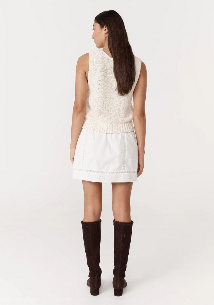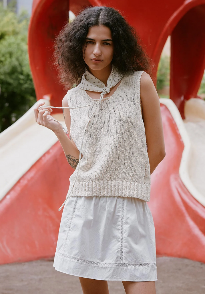A mini with subtle romance. The Suri Skirt in Bone is cut from mid-weight cotton with lace insert detailing and an elastic waist designed to sit low or high.