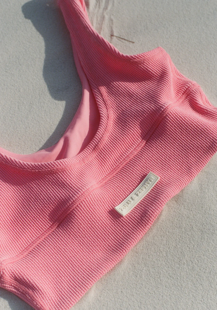 Made from a stretchy waffle-textured fabric with a dyed-to-match lining in a bright pink hue. Designed with a scoop neckline and a curved, elasticated hem band for natural support and comfort. Finished with slim straps and subtle shoulder binding for a clean, minimal look