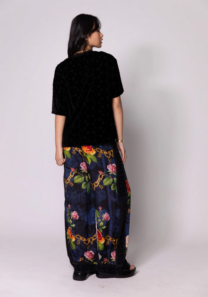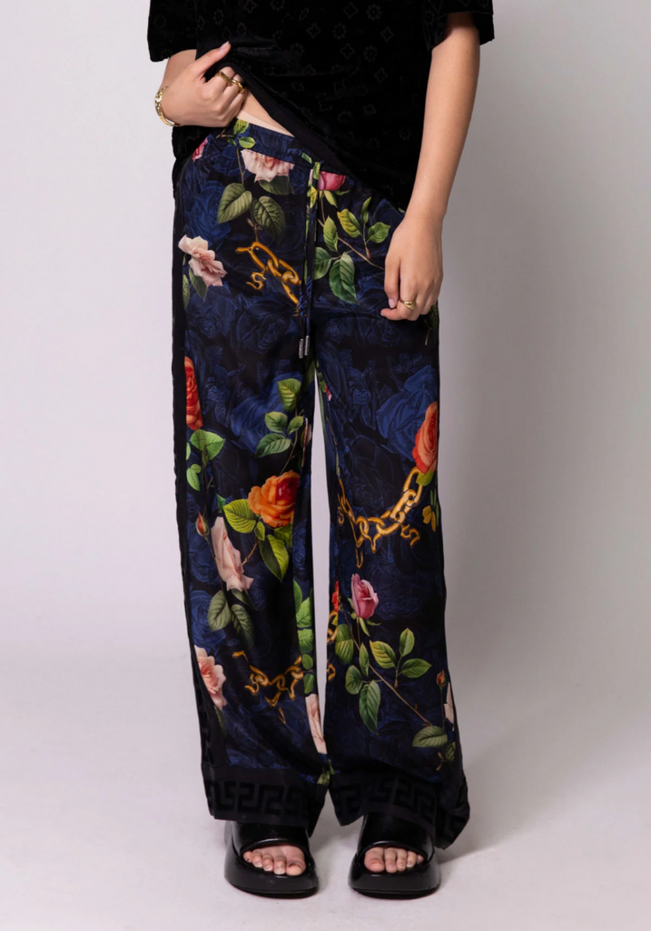 The Silk Chains and Roses Vacay Pants are all about ease and luxury. Made from 100% silk in our custom floral and chain print featuring a raised felt Geo pattern on black side panels. They are a relaxed fit with an adjustable drawstring waist with metal logo ends. They are versatile, lightweight, breathable, and a perfect wardrobe addition for the warmer months.
