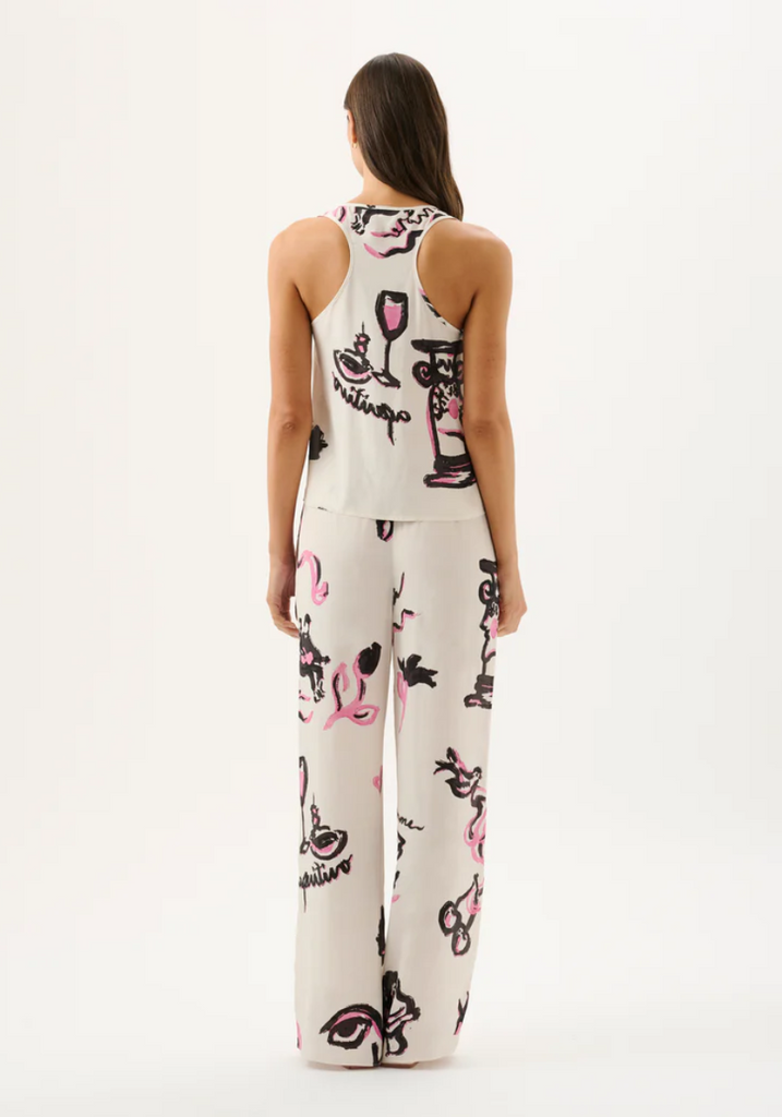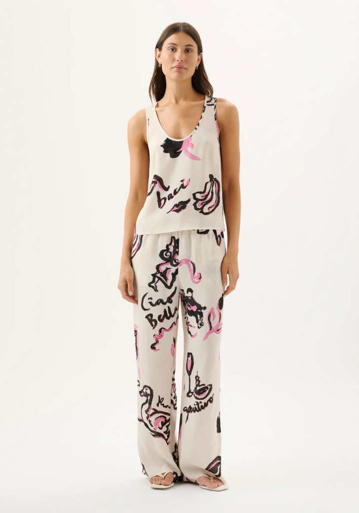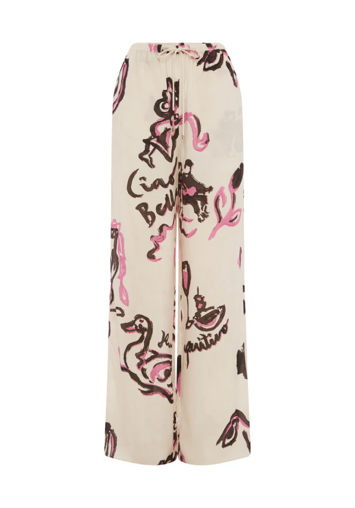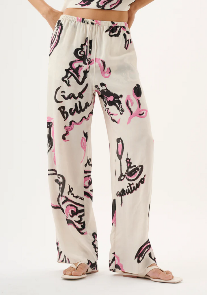 Rediscover the best-selling Miles Pant in the bespoke Baci print, featuring a relaxed straight-leg silhouette and an adjustable drawstring waist. A refined essential that brings ease and versatility to elevated everyday dressing.