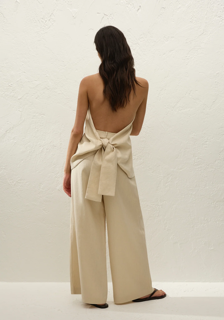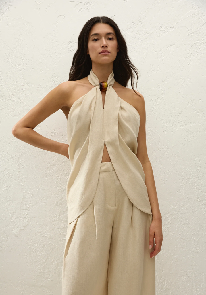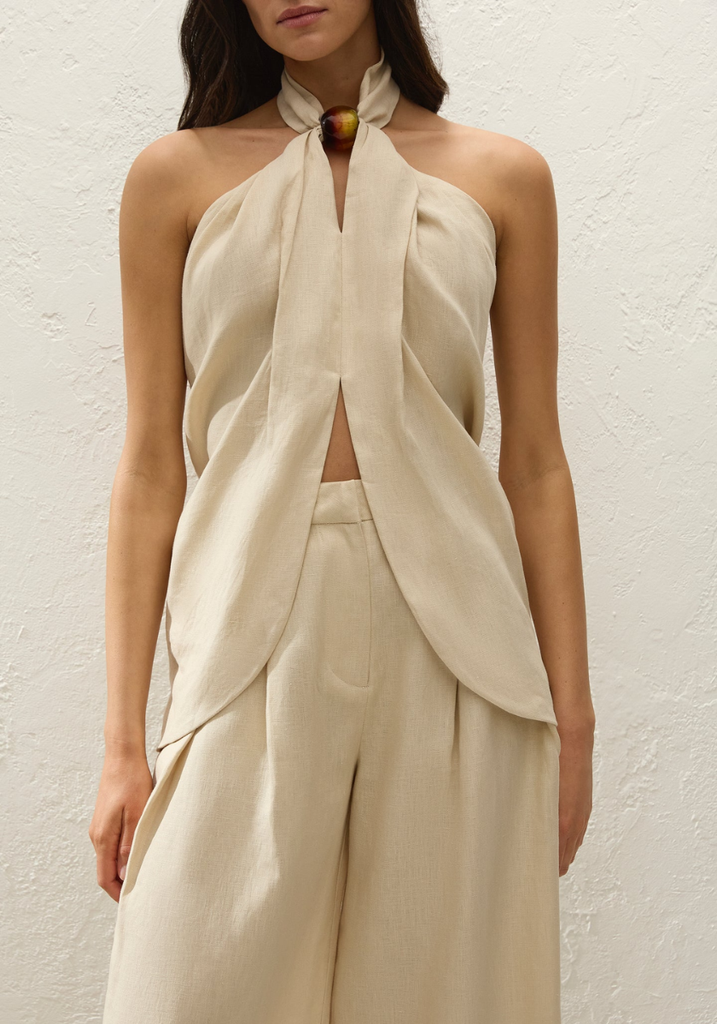 A halterneck top, designed from a signature 100% European Flax® linen in a warm neutral. Sitting high at the front deck, decorated with an oversized resin bead detail, it features an open back with a wide tie detail. The hem is curved, and is cut high through the front bodice, showing subtle skin. Style over the matching Sofia Trouser for refined yet relaxed vacation dressing.