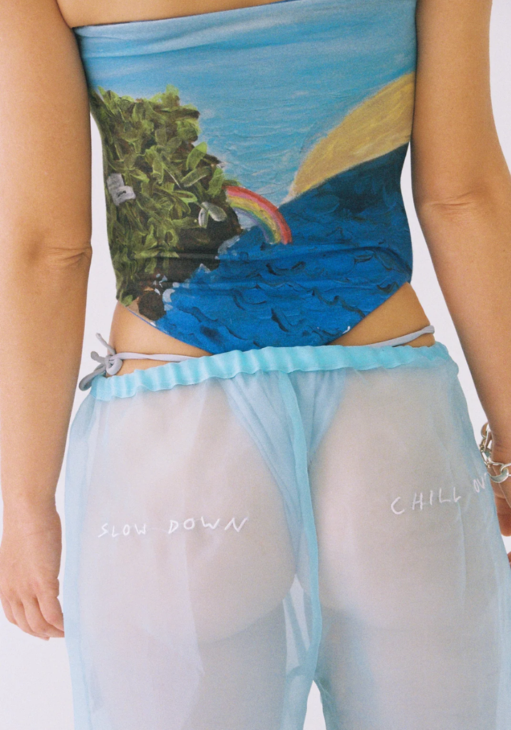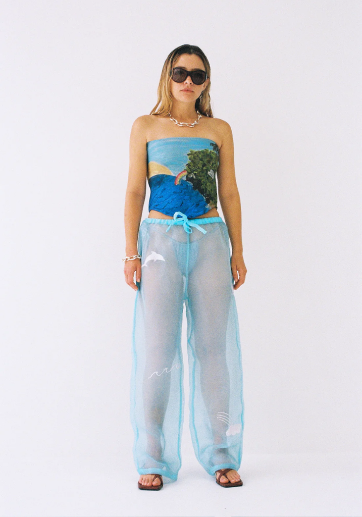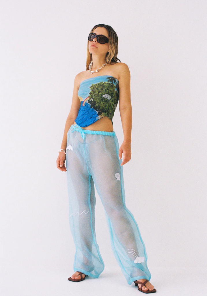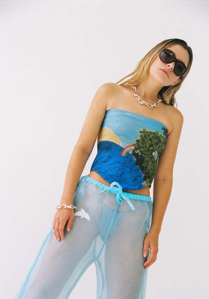 the SUNRISE CORSET is a boobtube with structured boning at side seams and dipped, curved hemline in luxurious cotton bamboo stretch fabric, fully lined/double sided for clean finish. In Lotties latest ART PRINT "the BAY" digitally printed onto the fabric.