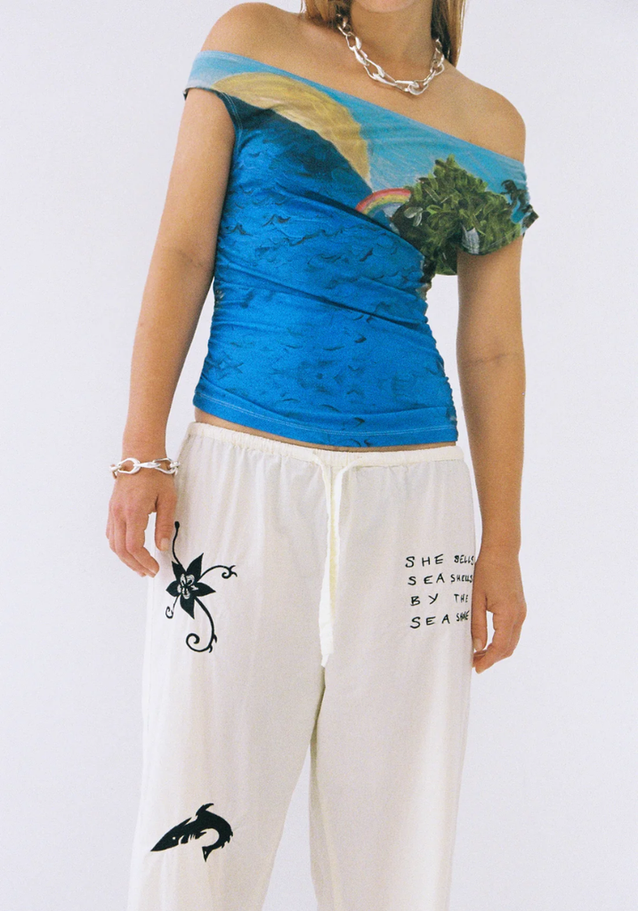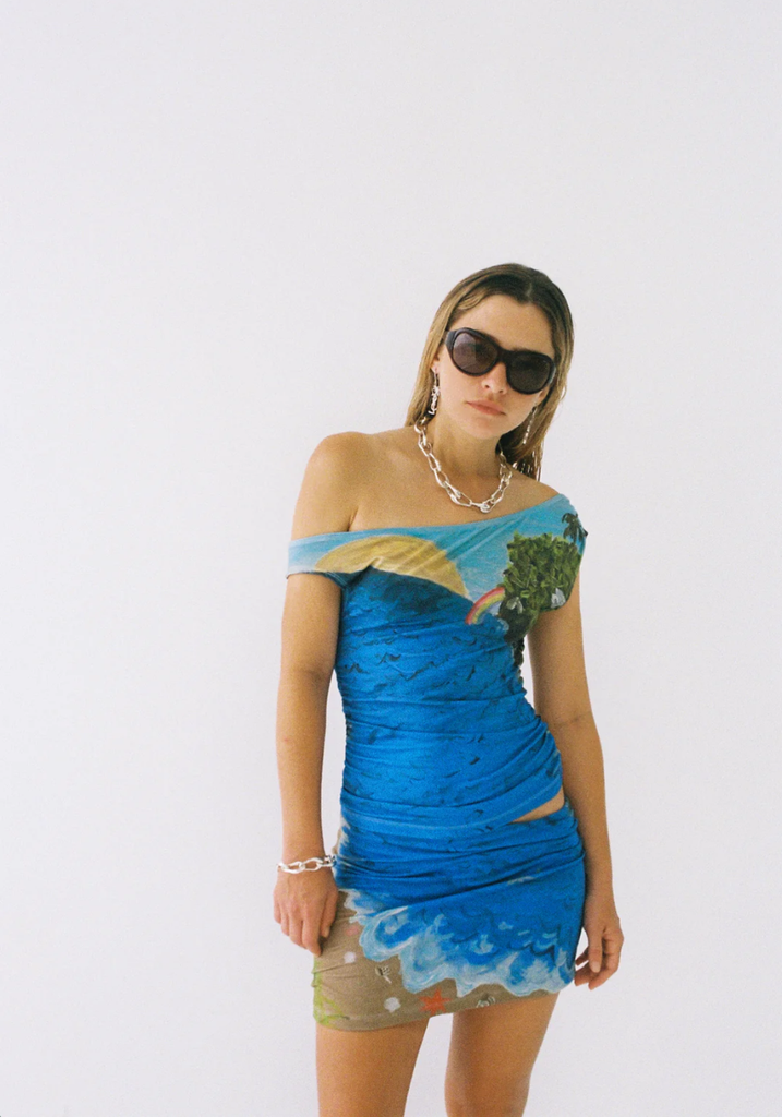 An off shoulder TOP in luxurious cotton bamboo stretch fabric, featuring gathered sides, and asymmetric neckline and sleeves. In Lotties latest ART PRINT "the BAY" digitally printed onto the fabric.