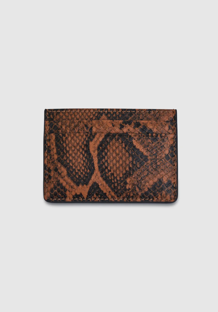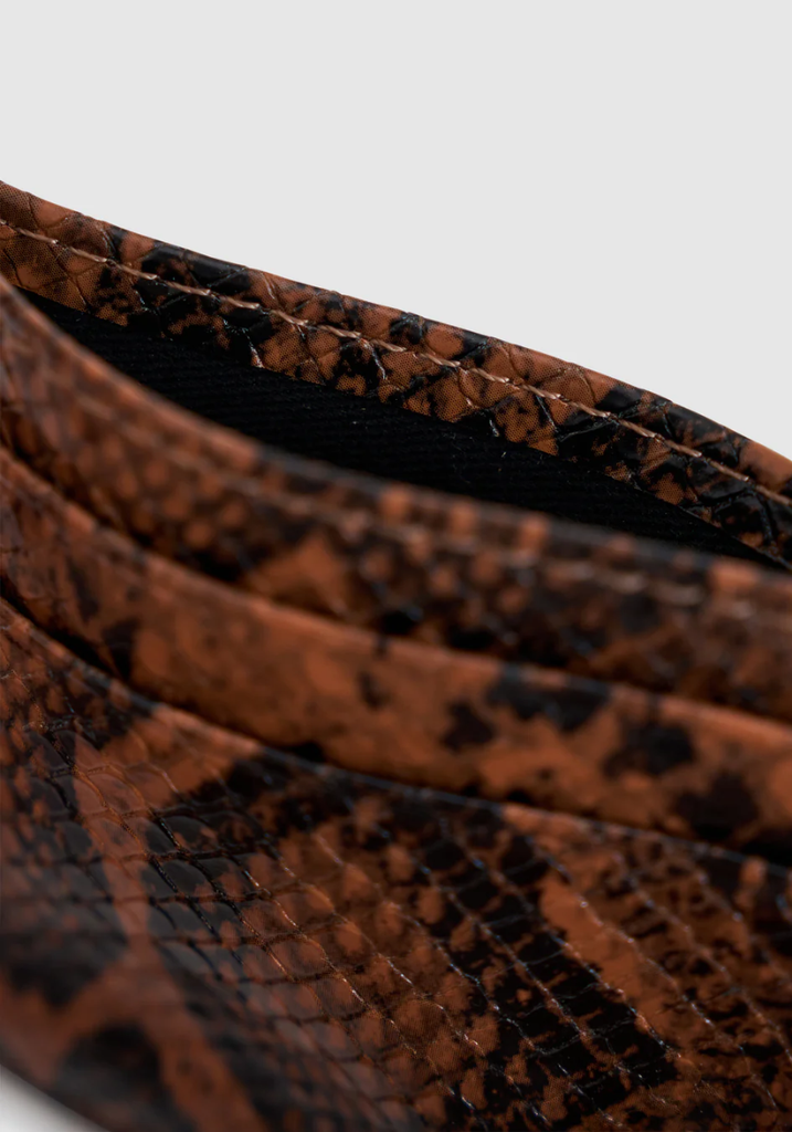A sleek and functional essential, the Adie Card Sleeve offers a refined approach to everyday organisation. Crafted from recycled polyurethane with a brunette python print and lined with 100% organic recycled cotton twill, it’s designed to hold your most-used cards in a slim, compact silhouette.