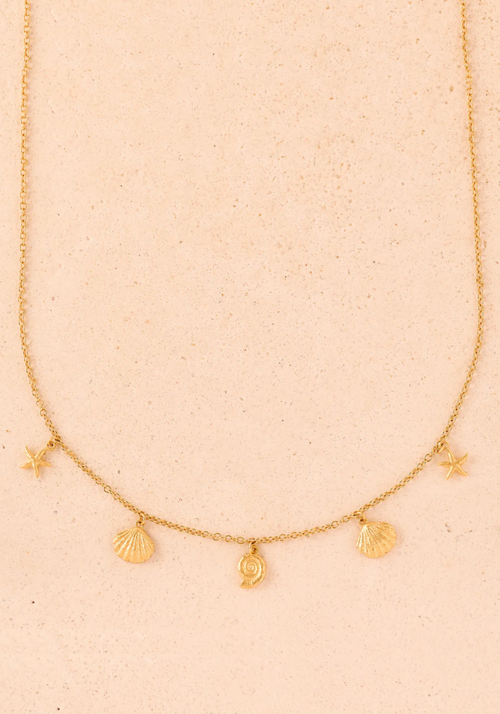 A dainty chain necklace with five small sea-inspired pendants. Finely detailed seashells and starfish, like treasures washed ashore.