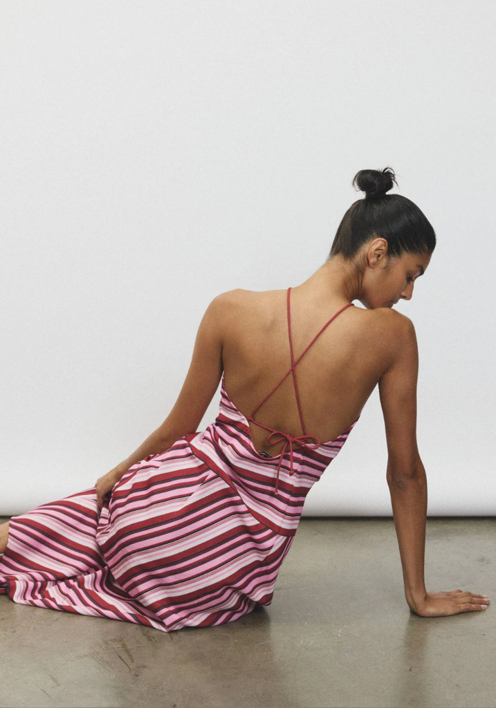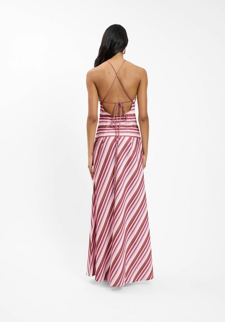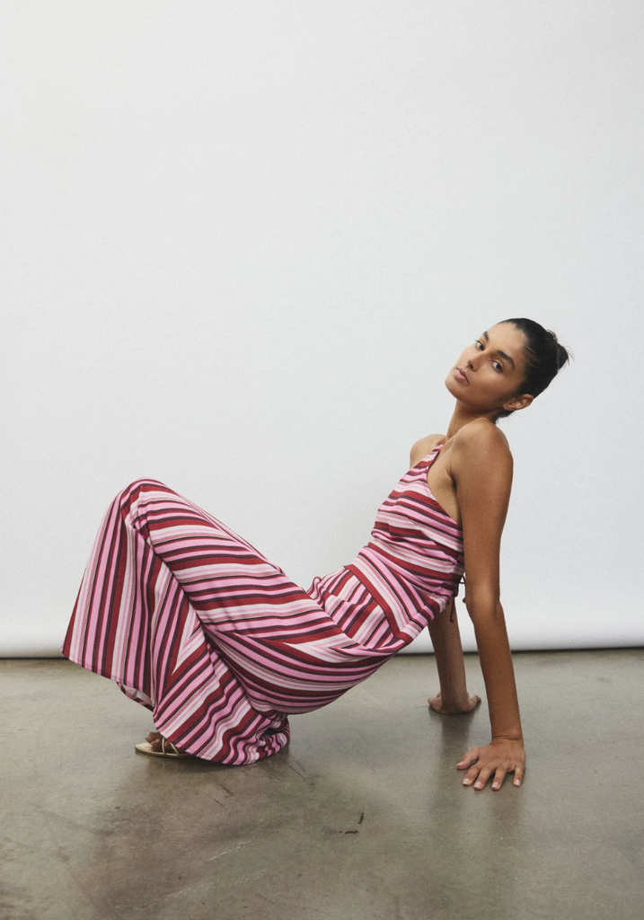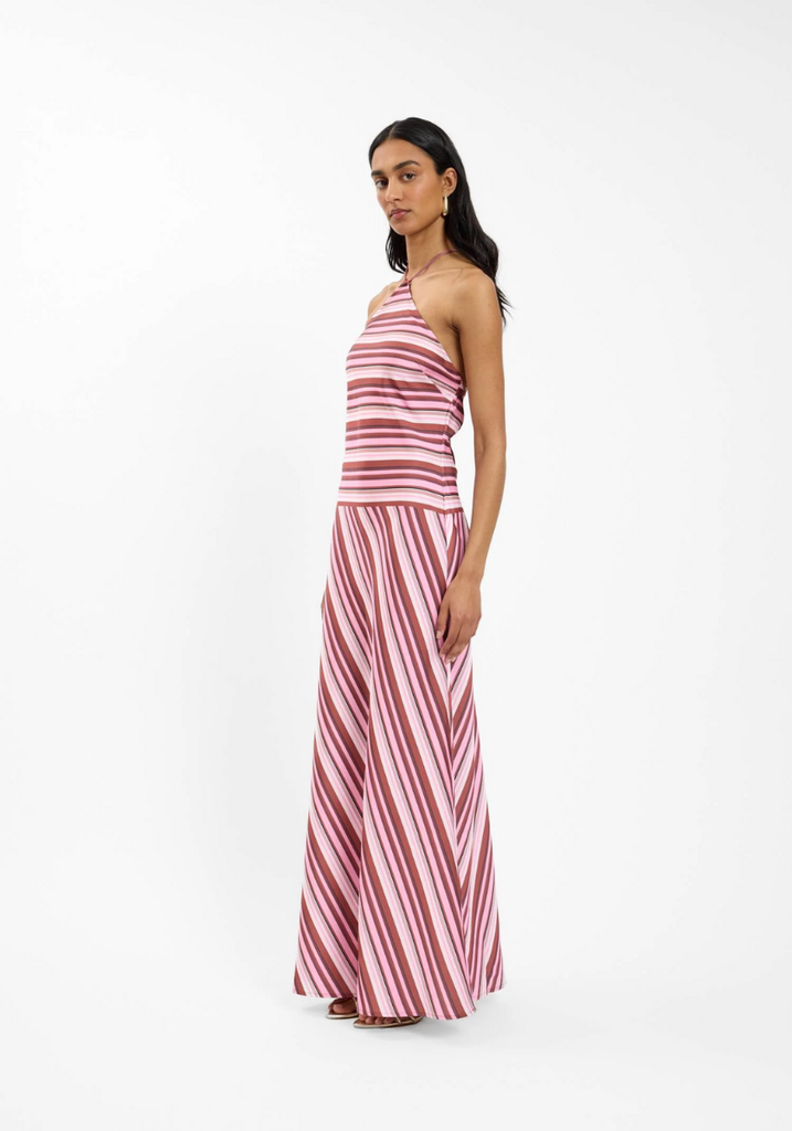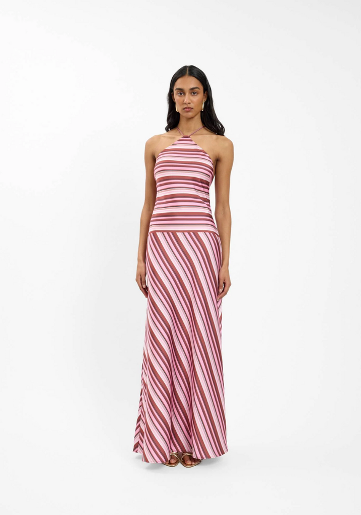 Discover the best-selling Halter Maxi Dress in an Exclusive Magenta Stripe hue. Cut on the bias for a fluid drape, this dress skims the silhouette with a soft A-line shape. The triangle neckline and thin straps frame the décolletage, while a low scooped back adds a touch of edge.