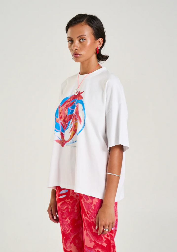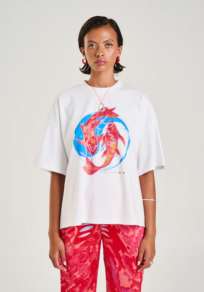 Boxy fit tee with custom hand painted Koi print design. True to size or size up for a bigger oversized look. Model wears size small.