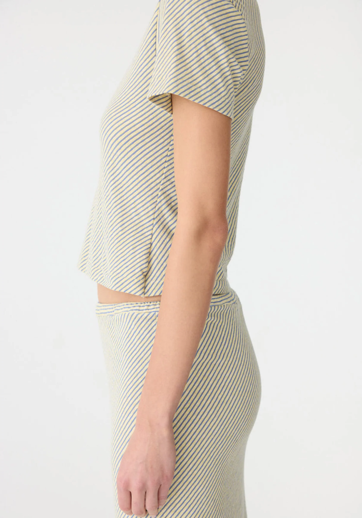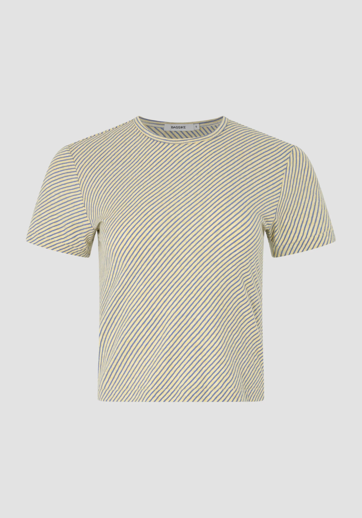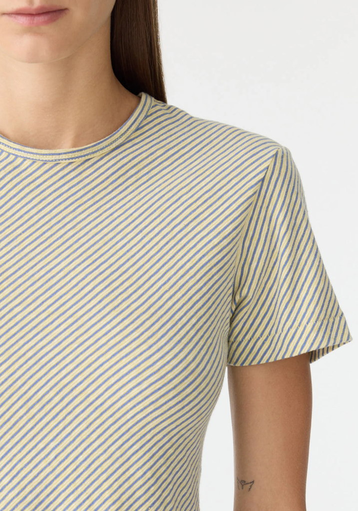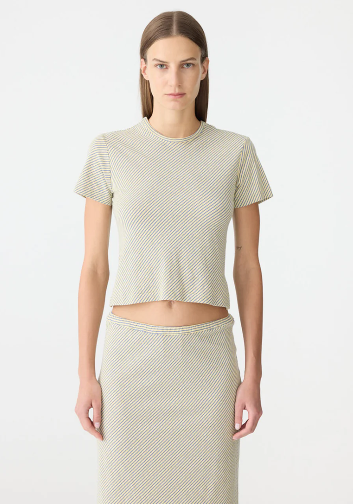 The Bias Stripe Baby T-Shirt is a slim fit, short sleeve style crafted from Japanese cotton stripe. Cut on the bias for a soft drape and natural movement, finished with a clean hem, self neck bind and signature Bassike stitching at the back neck.