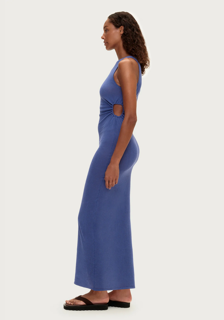 A slim fitting silhouette crafted from soft ramie, this maxi dress features a high neckline, sleeveless design, and a side-waist cut-out accented with an adjustable drawcord for a flattering, customisable fit. Designed in a rich blue hue, the look is finished with a semi-sheer finish for effortless elegance.