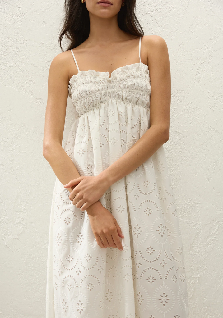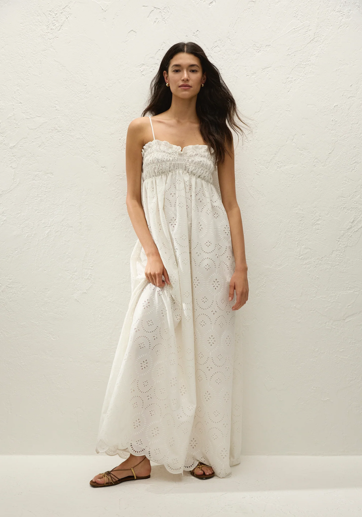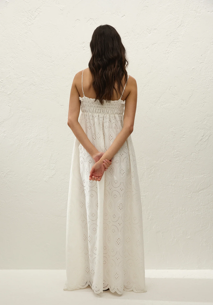 A vintage-inspired maxi dress, designed from a delicate cotton broderie in a warm white. Ruched through the bust with a delicate frill detail along the neckline and thin straps, adjustable in length, it falls into a gathered empire waist with an A-line skirt. Lightweight with effortless appeal, style with a simple sandal for long sun-drenched days and balmy evenings.